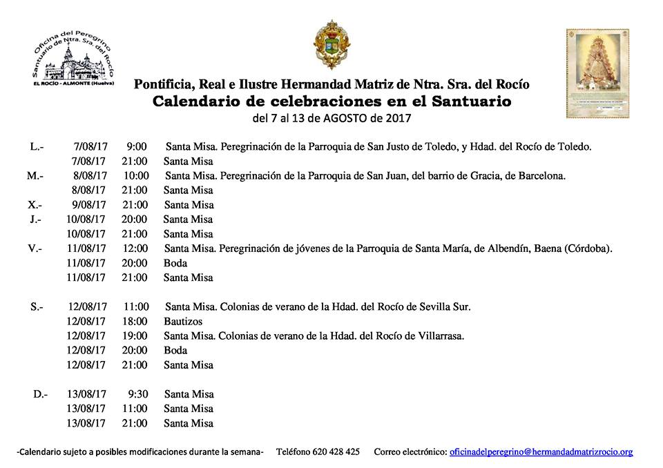 Calendario de Celebraciones en el Santuario del Rocío del 7 al 13 de agosto de 2017