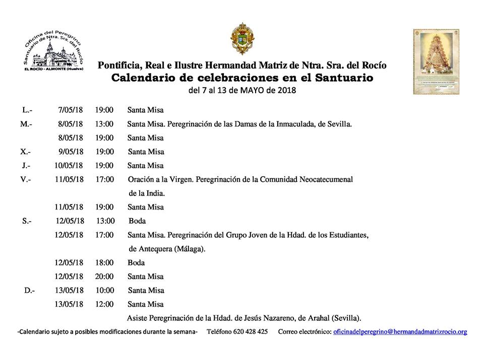 Calendario de Celebraciones en el Santuario del Rocío del 7 al 13 de mayo de 2018