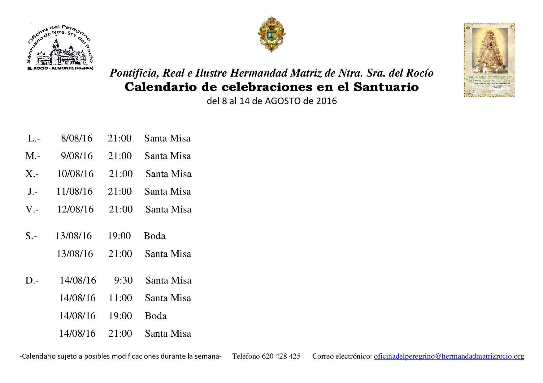 Calendario Santuario Rocio 8 al 14 de 8 de 2016
