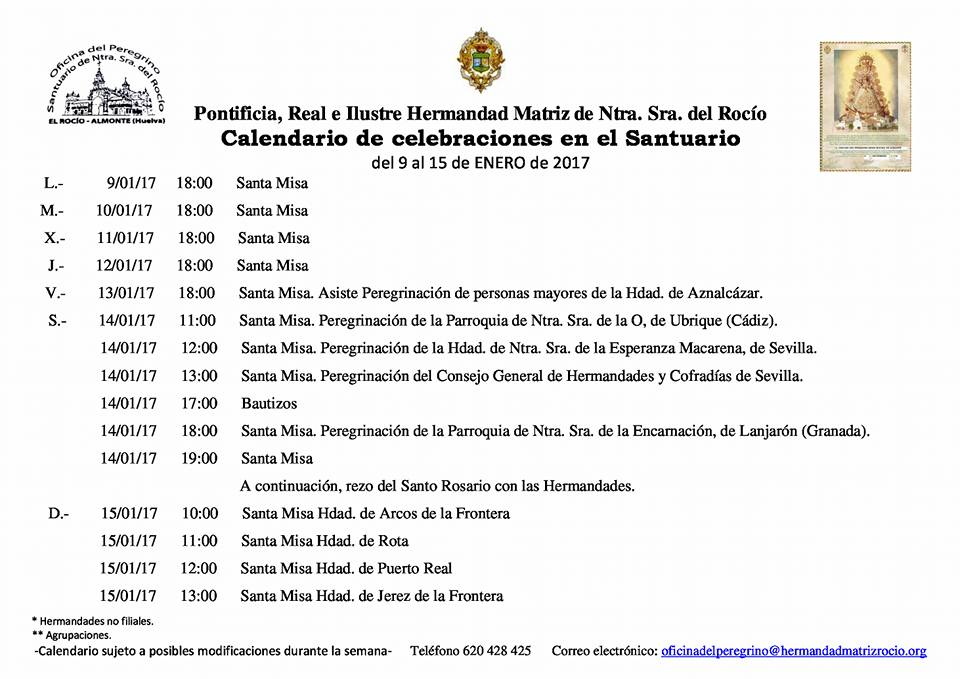 Calendario de Celebraciones en el Santuario del Rocío del 9 al 15 de enero de 2017