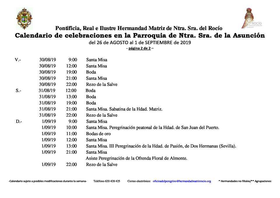 Calendario de Celebraciones en la Parroquia de la Asunción de Almonte del 26 de agosto al 1 de septiembre de 2019