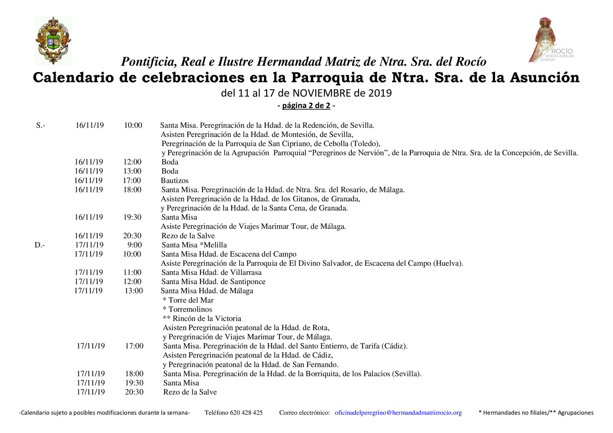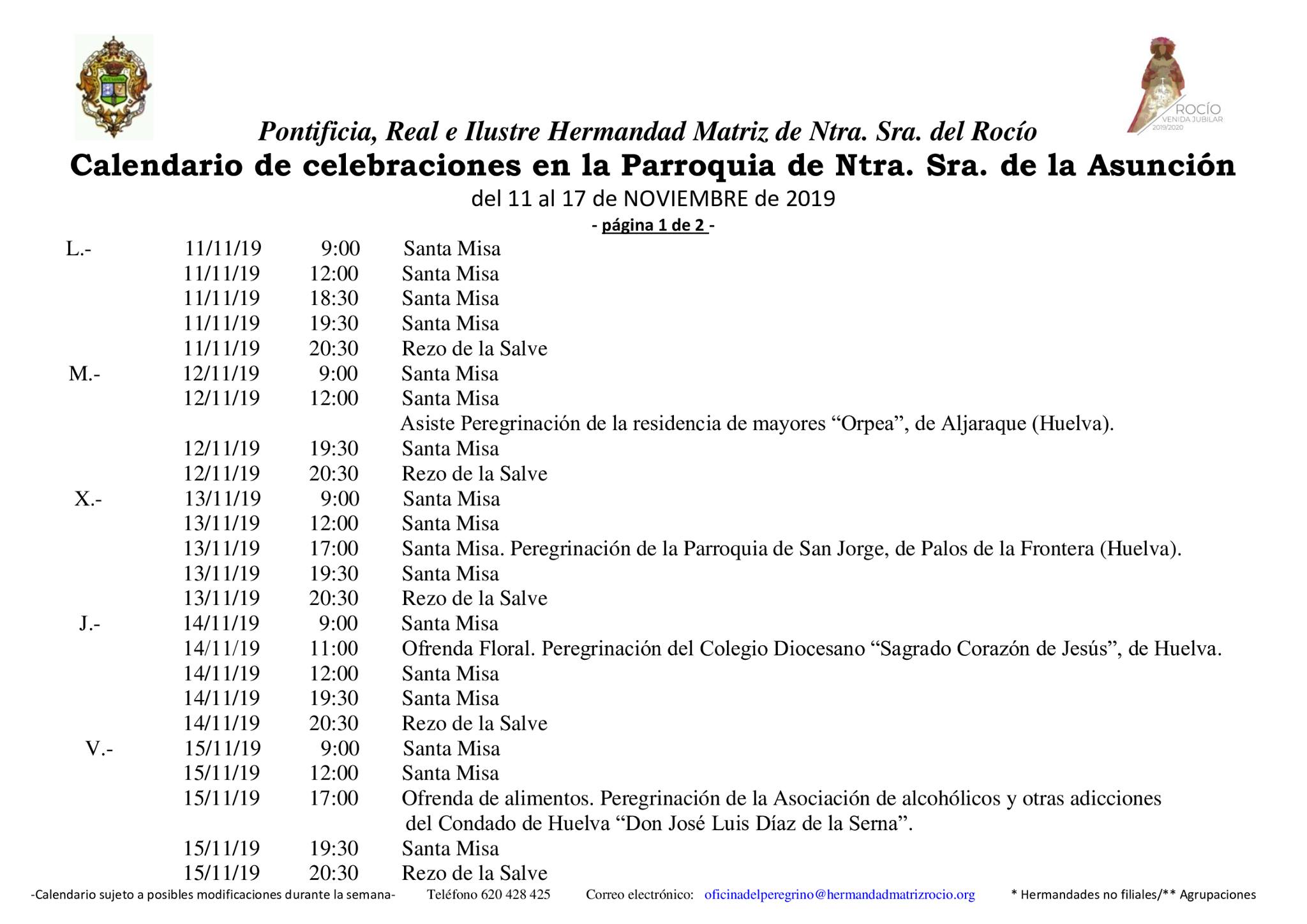 Calendario de Celebraciones en la Parroquia de la Asunción del 11 al 17 de noviembre de 2019