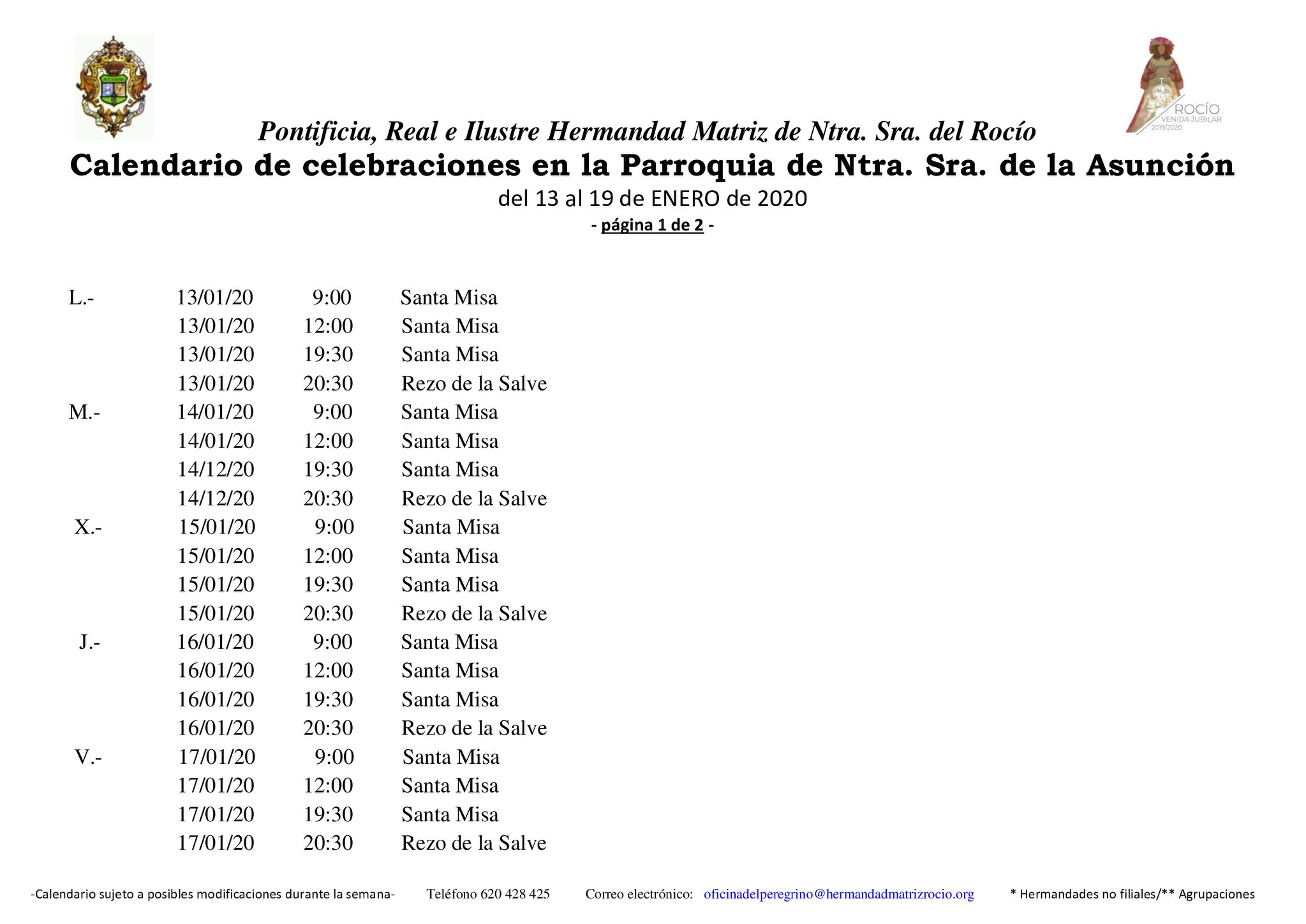 Calendario de Celebraciones en la Parroquia de la Asunción del 13 al 19 de enero de 2020