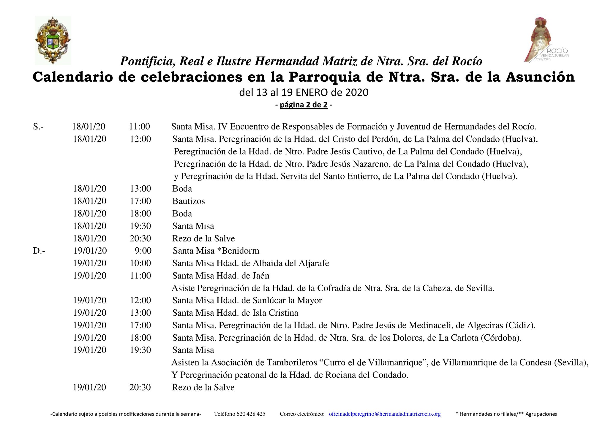 Calendario de Celebraciones en la Parroquia de la Asunción del 13 al 19 de enero de 2020.