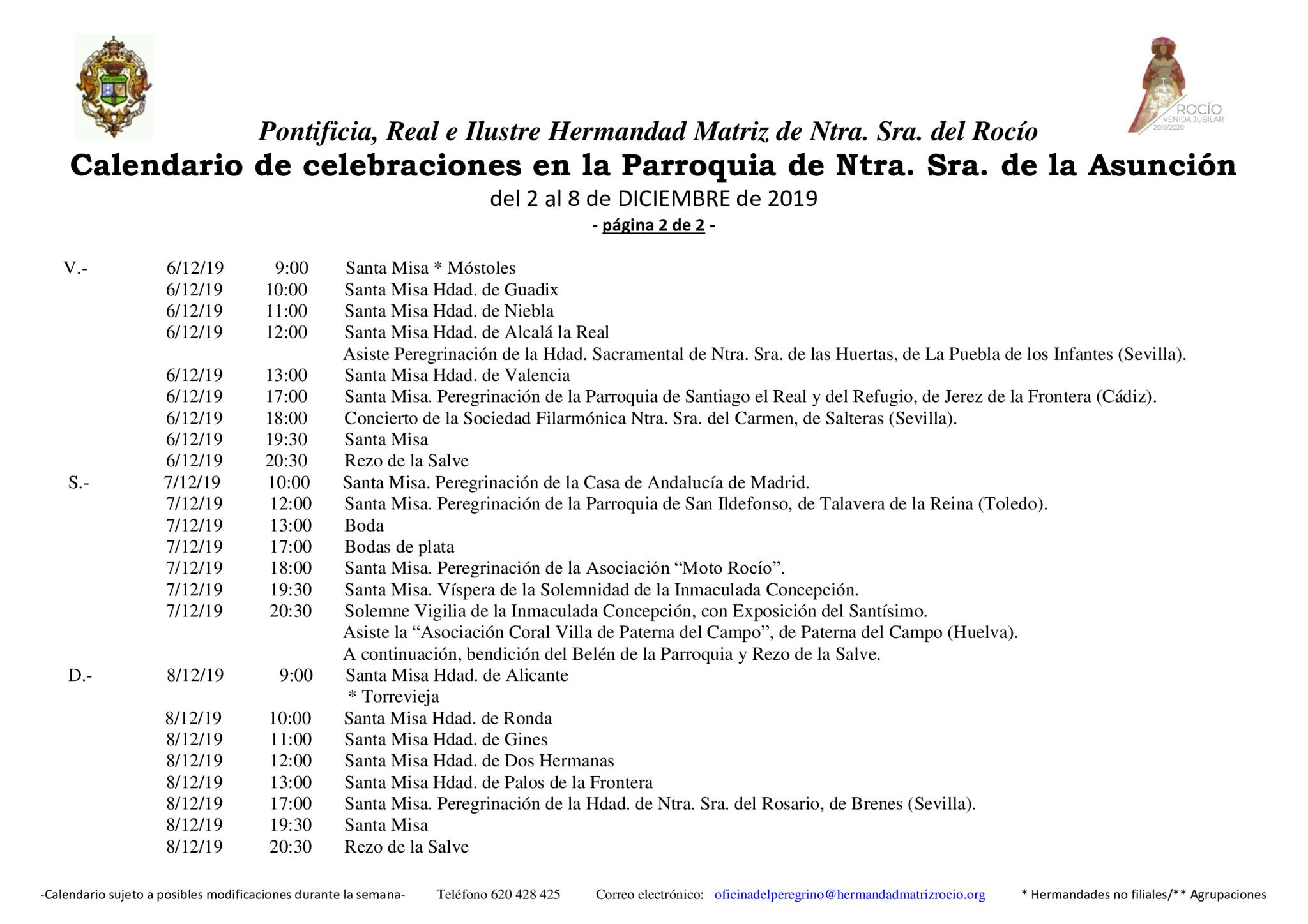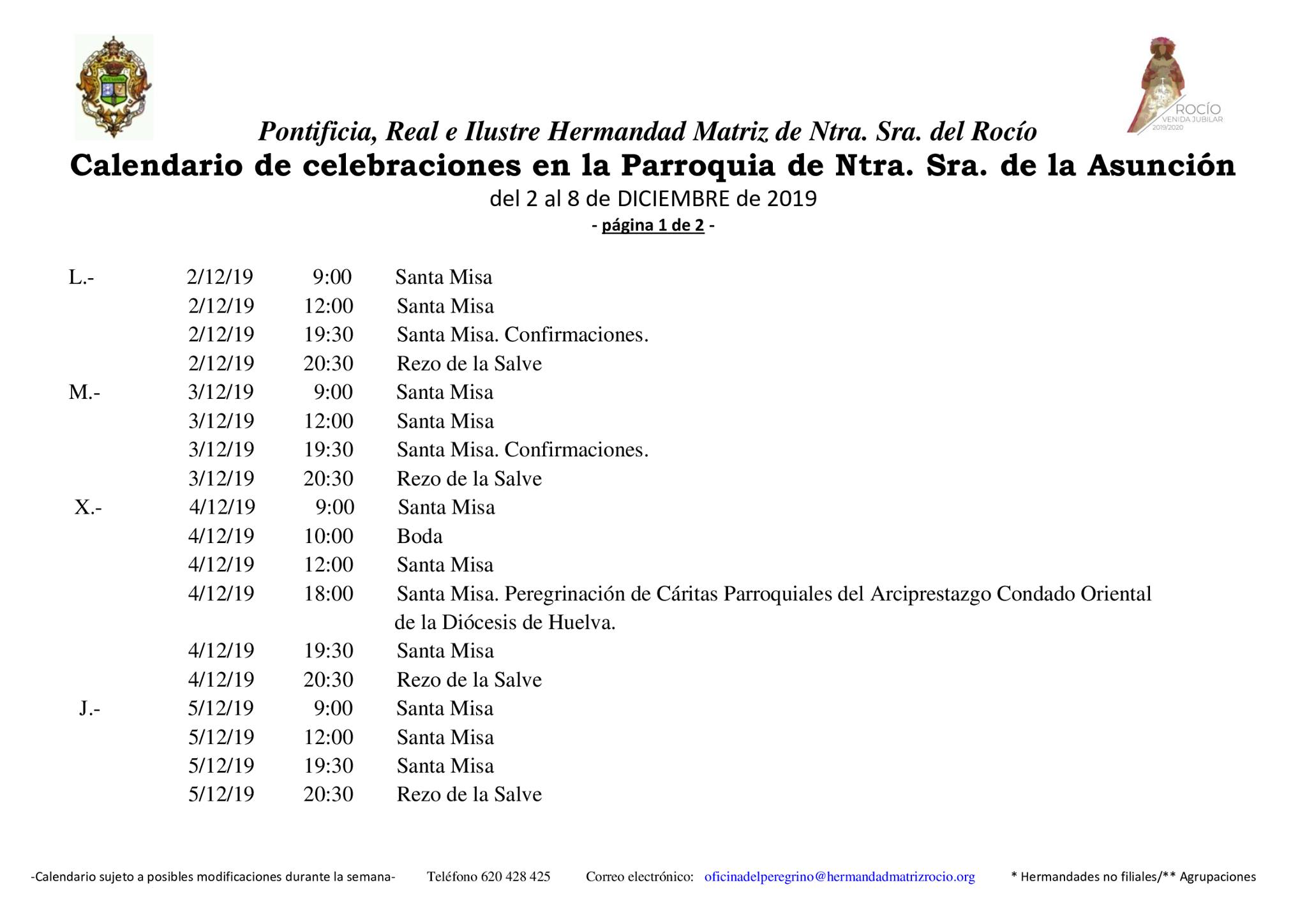 Calendario de Celebraciones en la Parroquia de la Asunción del 2 al 8 de diciembre de 2019.
