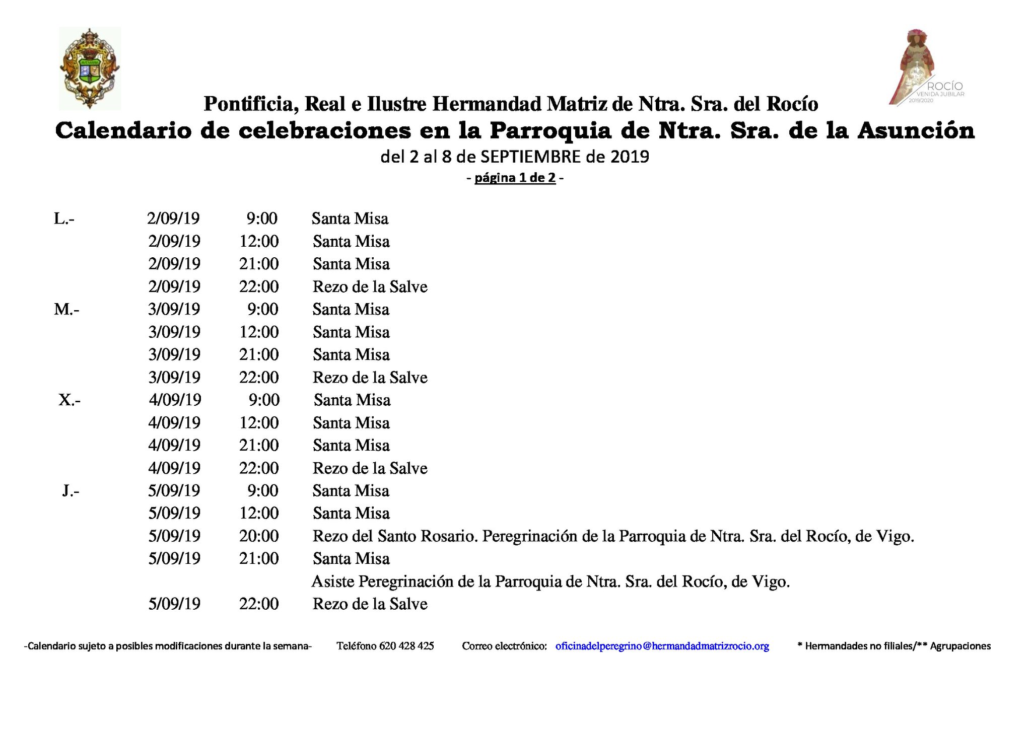 Calendario de Celebraciones en la Parroquia de la Asunción del 2 al 8 de septiembre de 2019