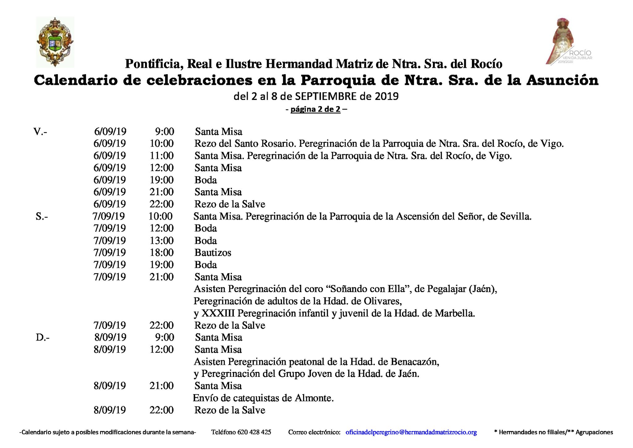 Calendario de Celebraciones en la Parroquia de la Asunción del 2 al 8 de septiembre de 2019.