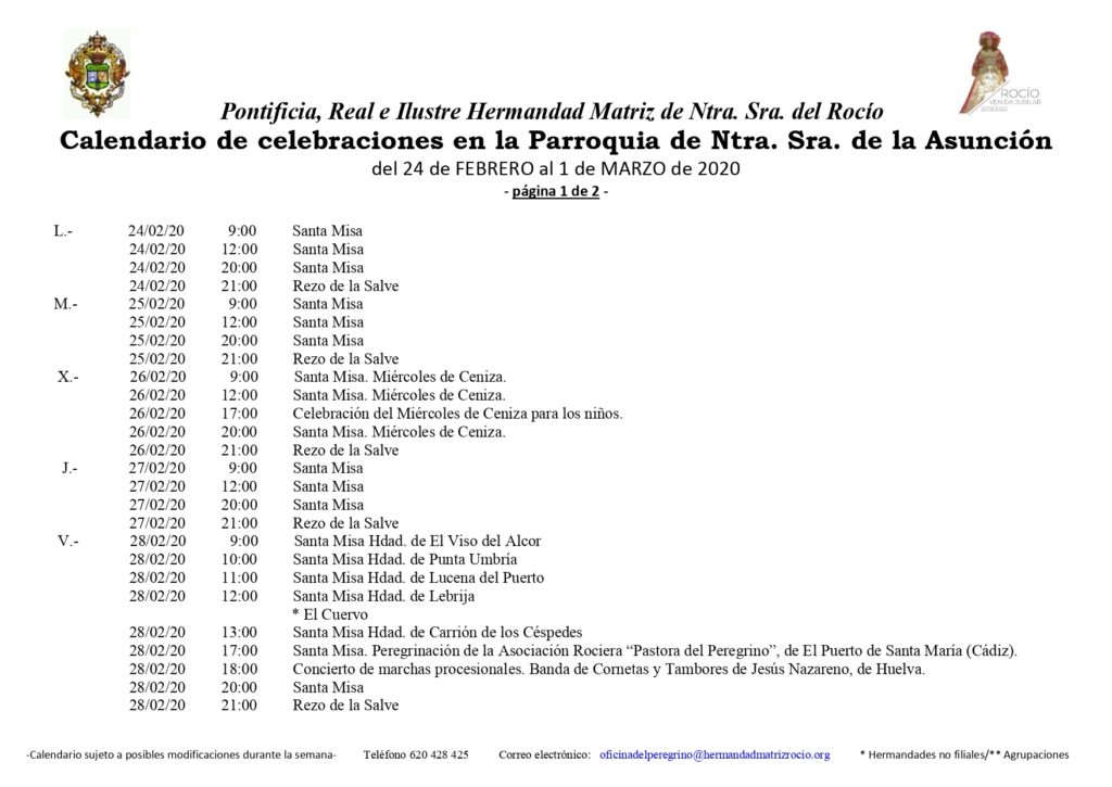 Calendario de Celebraciones en la Parroquia de la Asunción del 24 de febrero al 1 de marzo de 2020