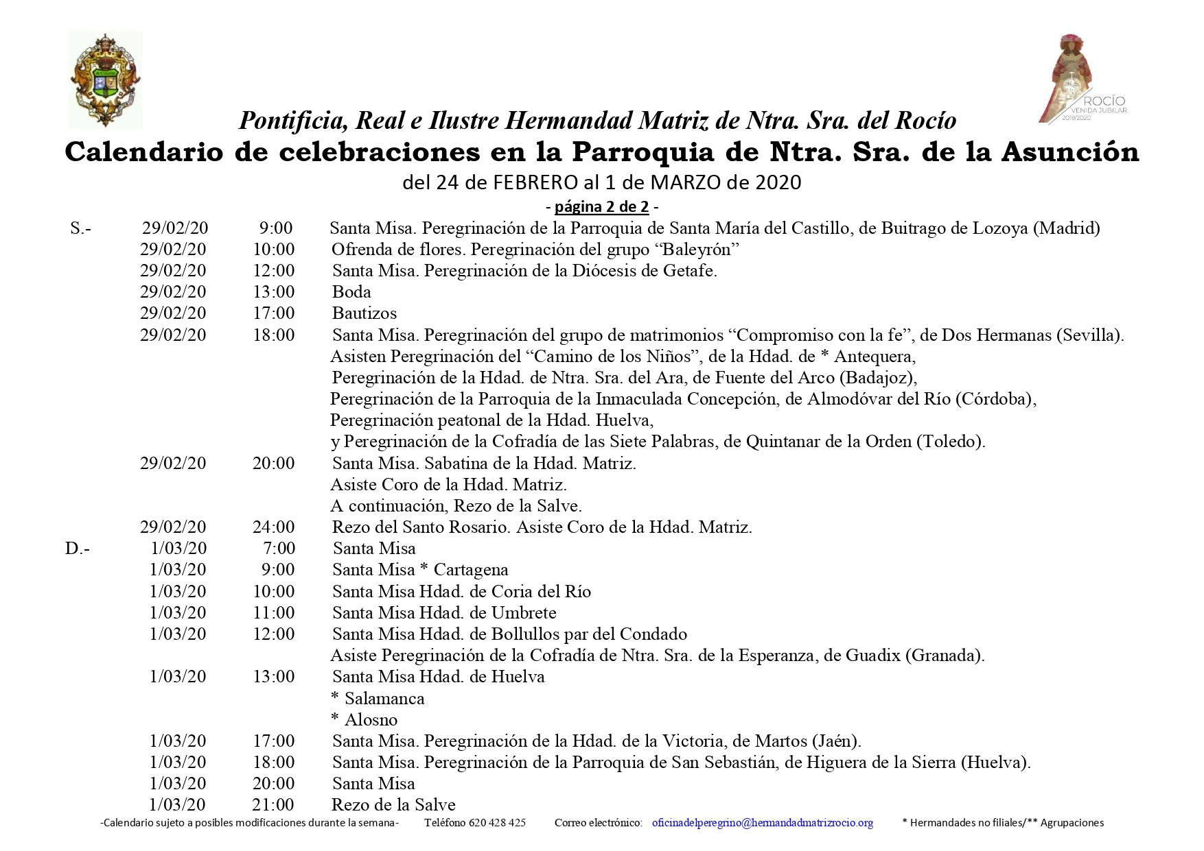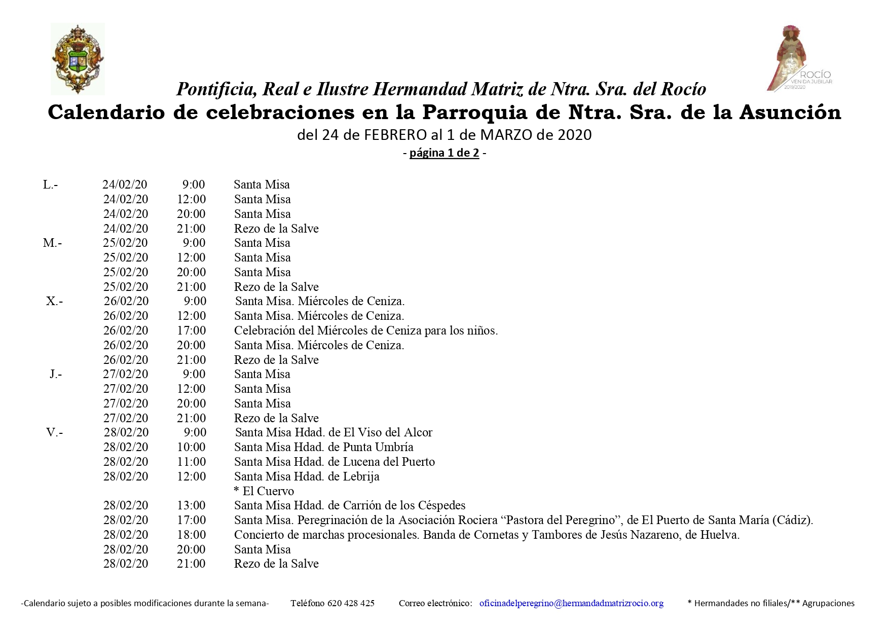 Calendario de Celebraciones en la Parroquia de la Asunción del 24 de febrero al 1 de marzo de 2020.