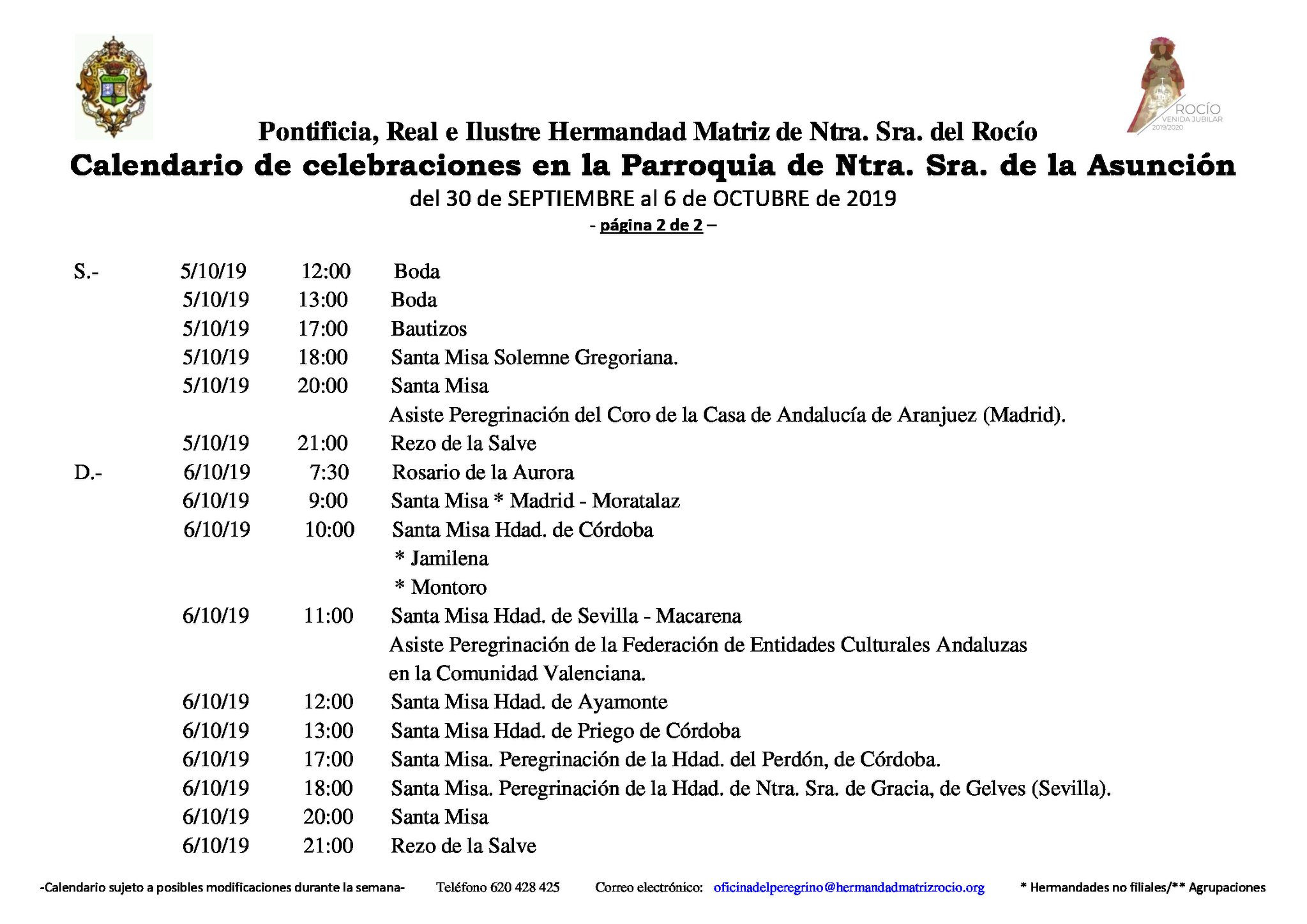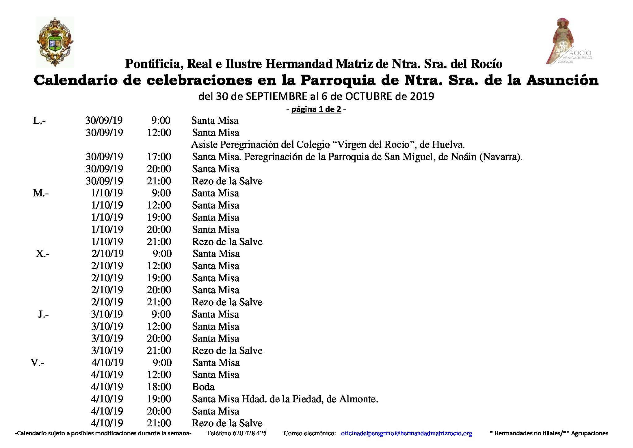 Calendario de Celebraciones en la Parroquia de la Asunción del 30 de septiembre al 6 de octubre de 2019