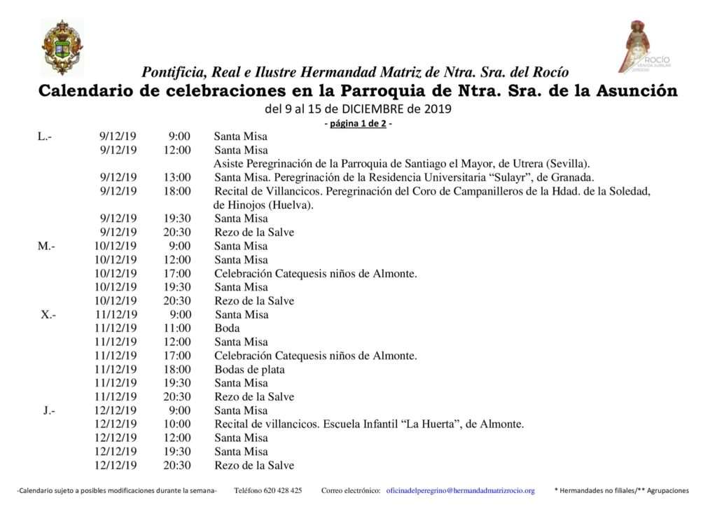 Calendario de Celebraciones en la Parroquia de La Asunción del 9 al 15 de diciembre de 2019