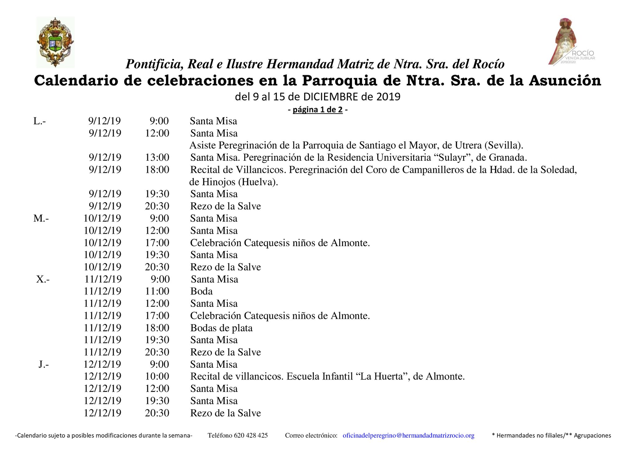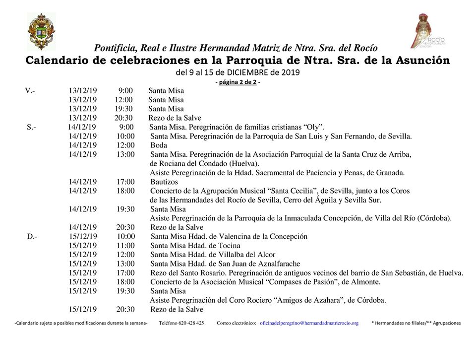 Calendario de Celebraciones en la Parroquia de La Asunción del 9 al 15 de diciembre de 2019.