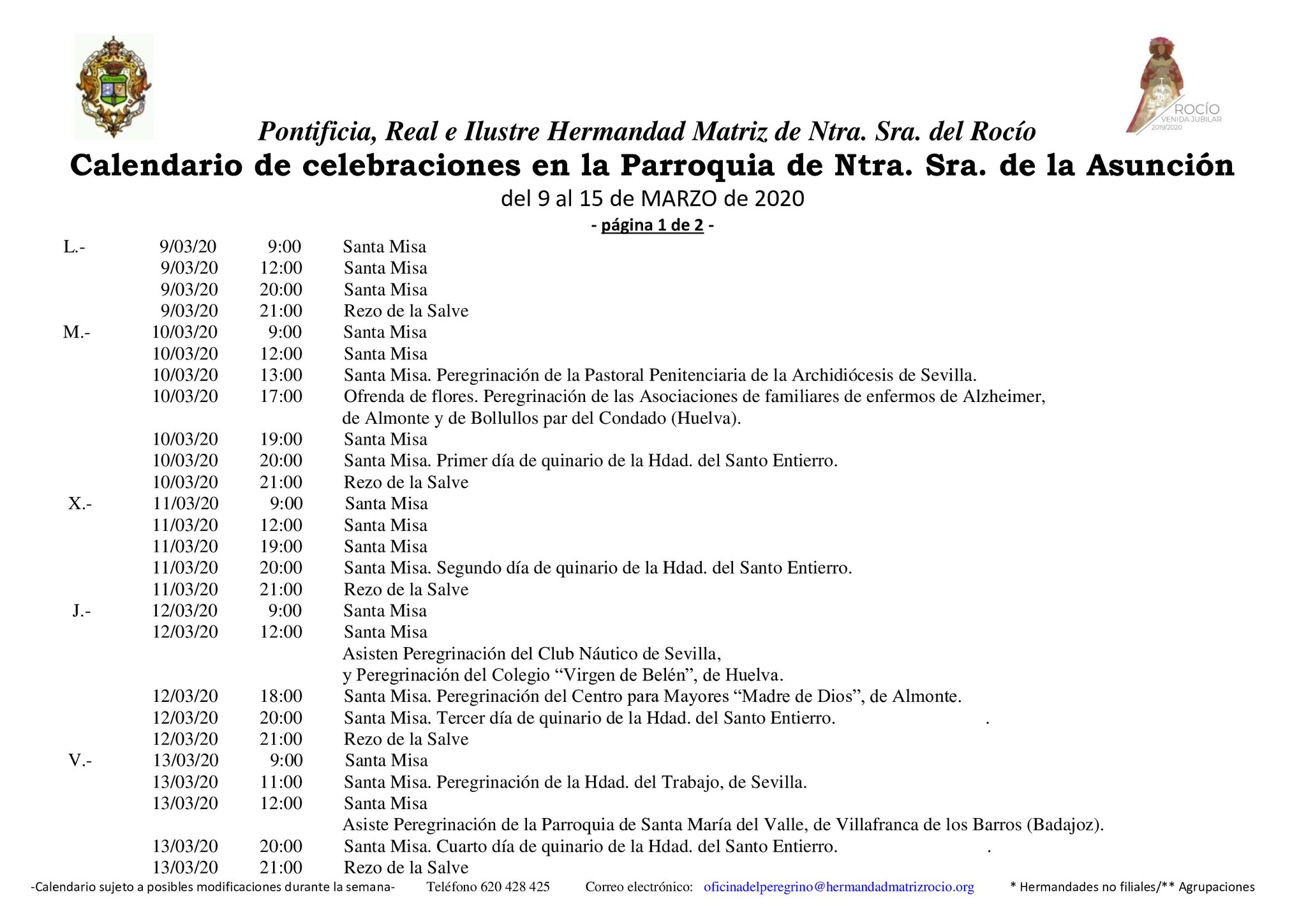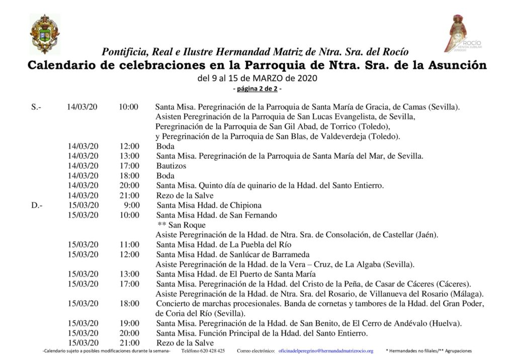 1. Las peregrinaciones de los dos últimos domingos (15 y 22 de marzo) del calendario de peregrinaciones extraordinarias de hermandades del Rocío. Son las hermandades de Chipiona, San Fernando, La Puebla del Río, Sanlúcar de Barrameda, Puerto de Santa María, Torrejón de Ardoz, Pozuelo de Alarcón y Toledo, Asociación de San Roque y las hermandades no filiales de Montequinto y Coria-Cáceres.