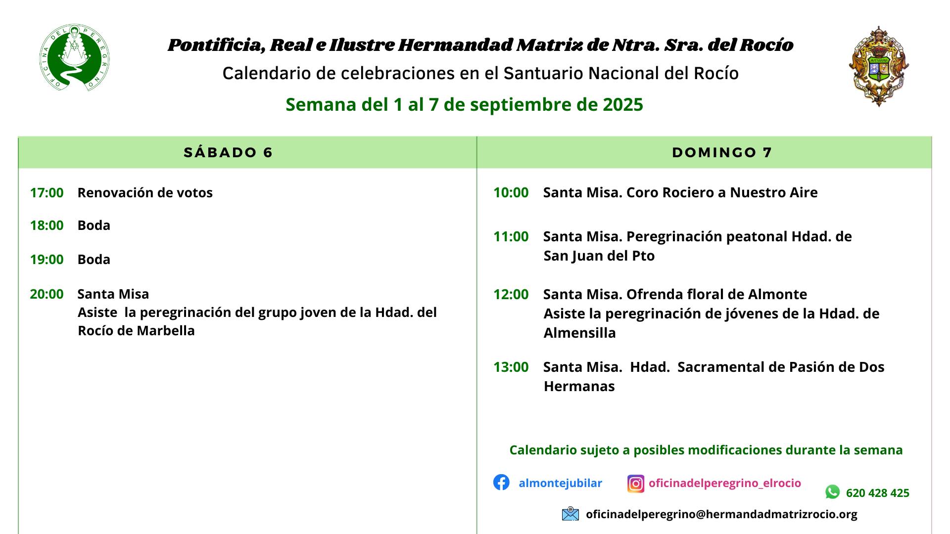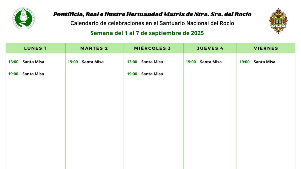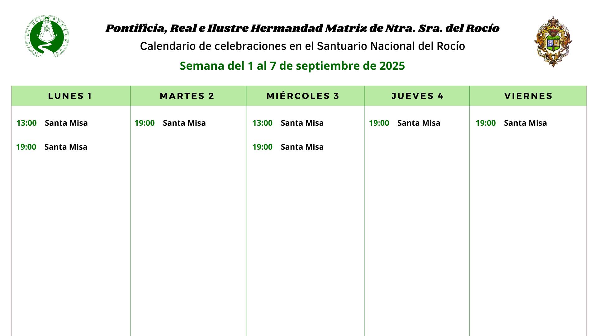Calendario de celebraciones para la semana del 1 al 7 de septiembre de 2025 en el Santuario de Ntra. Sra. del Rocío.
