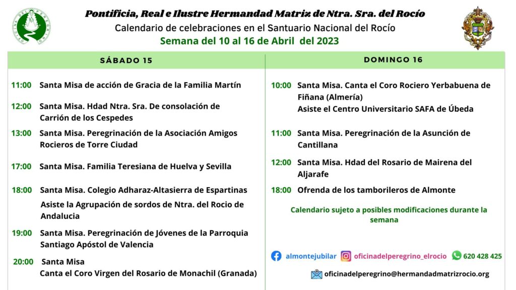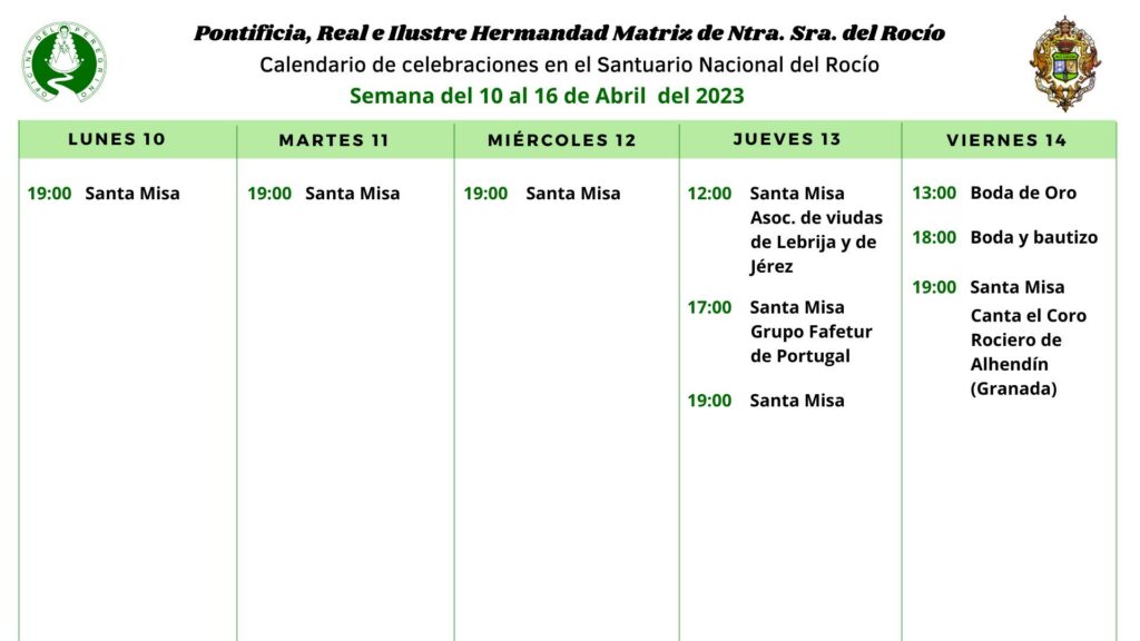 Calendario de celebraciones para la semana del 10 al 16 de abril, en el Santuario de Ntra. Sra. del Rocío.