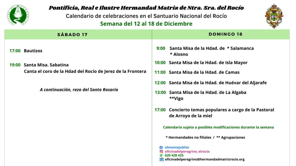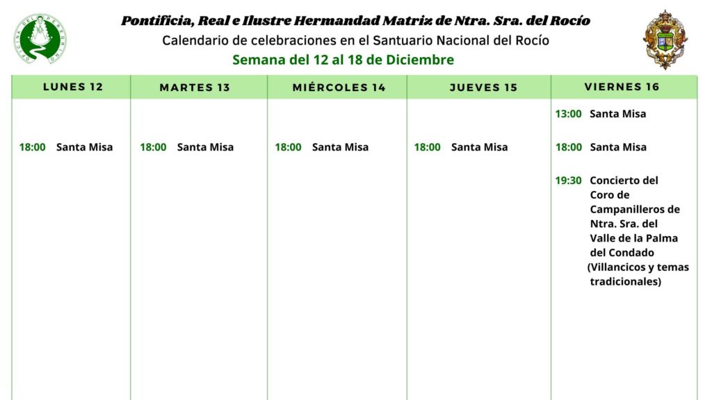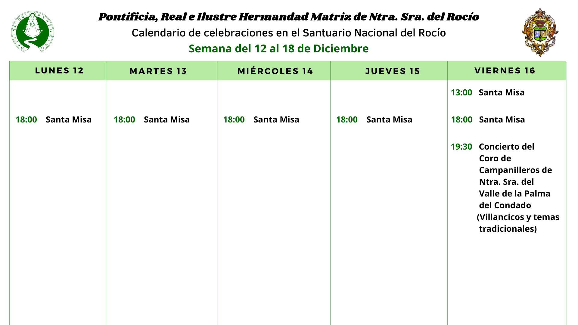 Calendario de celebraciones para la semana del 12 al 18 de Diciembre, en el Santuario de Ntra. Sra. del Rocío.