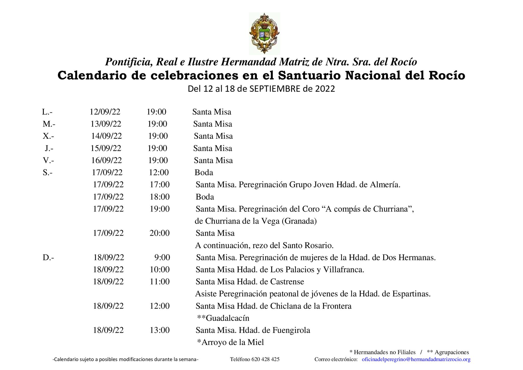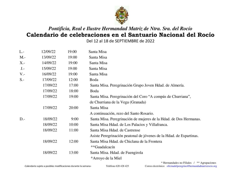 Calendario de celebraciones para la semana del 12 al 18 de septiembre 2022, en el Santuario de Ntra. Sra. del Rocio.