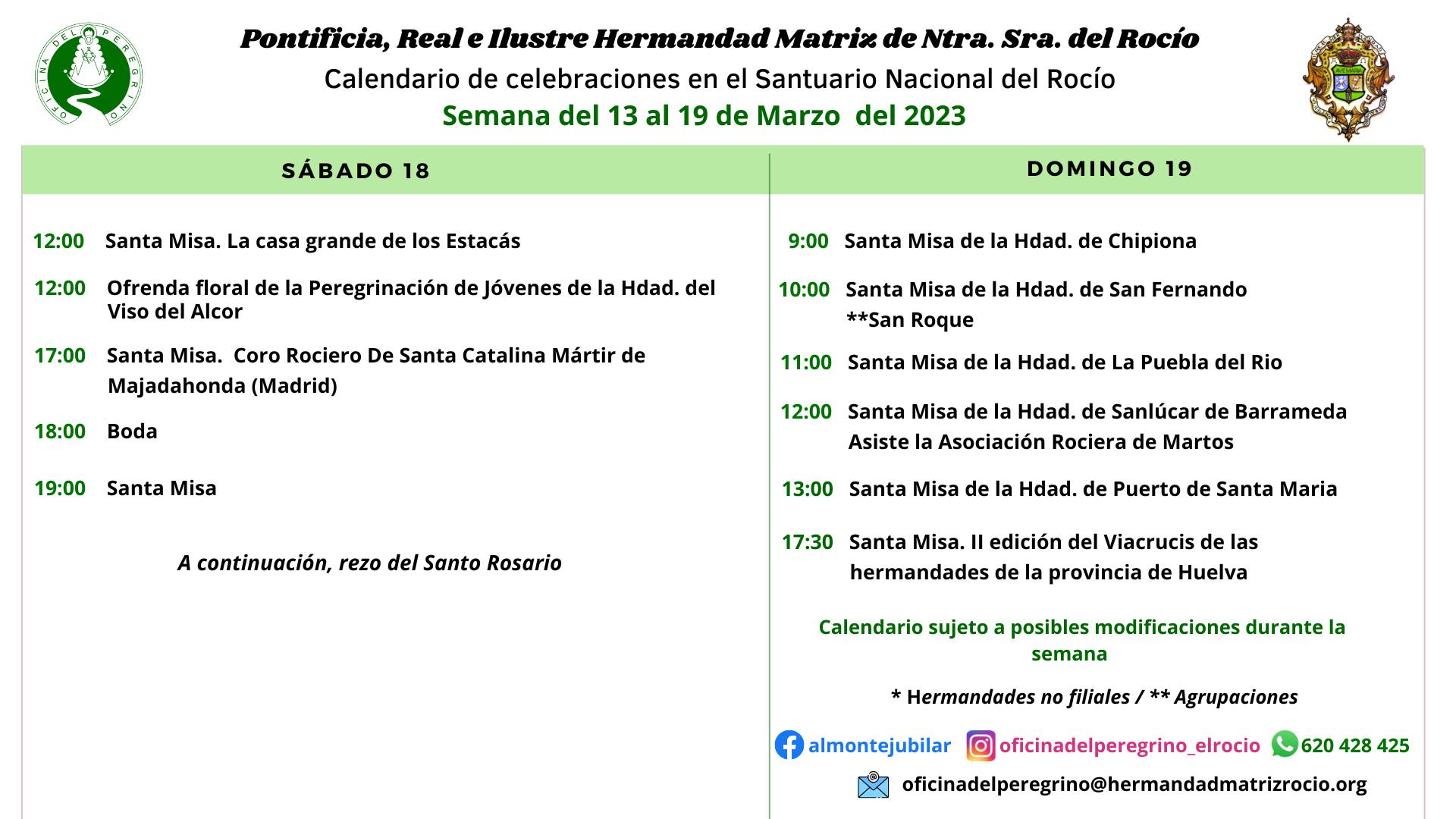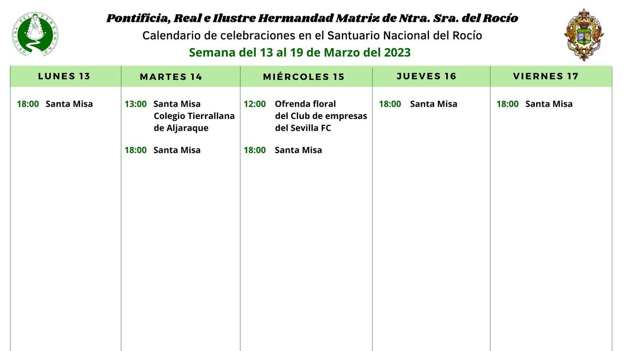 Calendario de celebraciones para la semana del 13 al 19 de marzo, en el Santuario de Ntra. Sra. del Rocío.