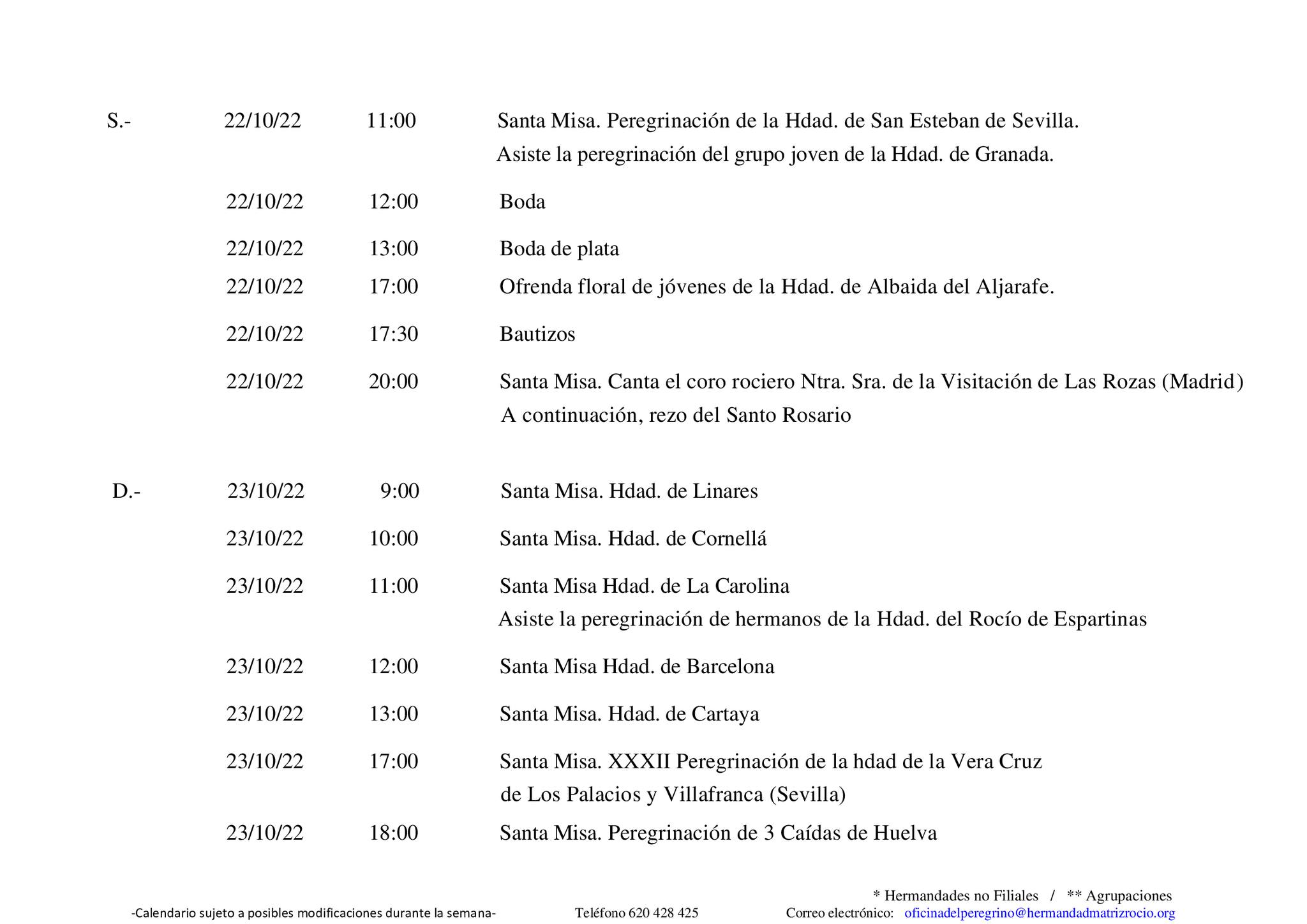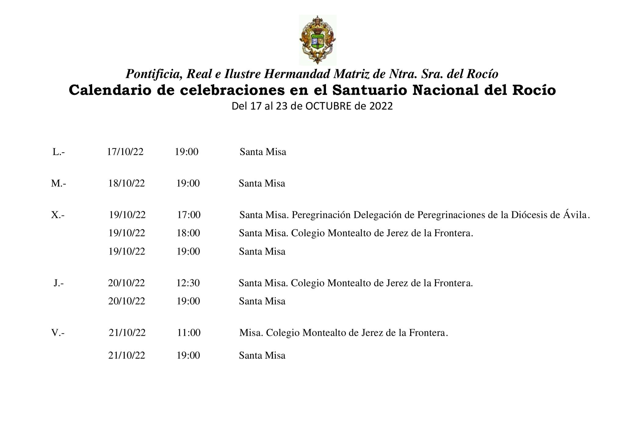 Calendario de celebraciones para la semana del 17 al 23 de octubre 2022, en el Santuario de Ntra. Sra. del Rocío