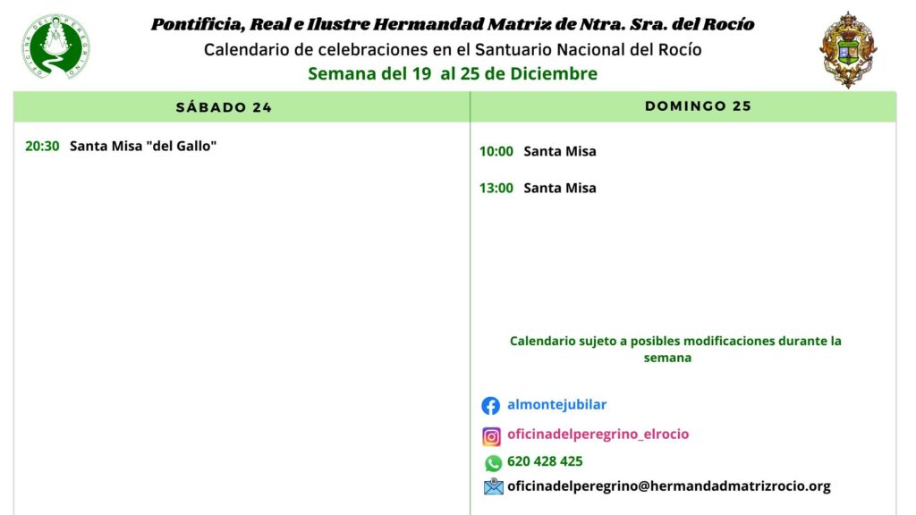 Calendario de celebraciones para la semana del 19 al 25 de Diciembre, en el Santuario de Ntra. Sra. del Rocío.