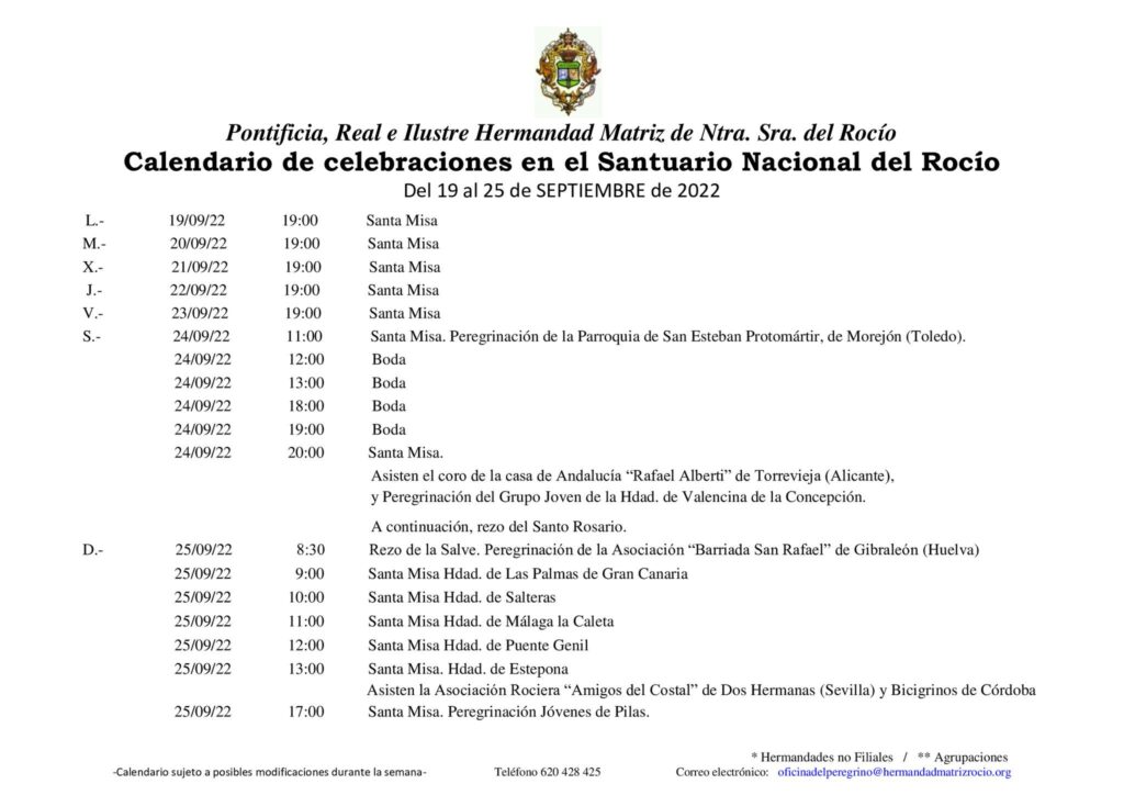 Calendario de celebraciones para la semana del 19 al 25 de septiembre en el Santuario del Rocío