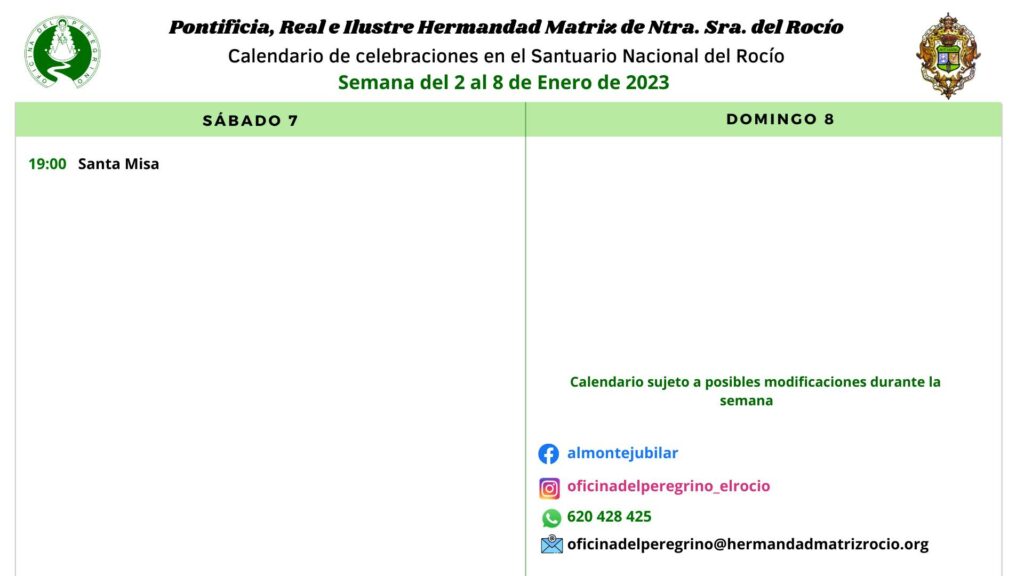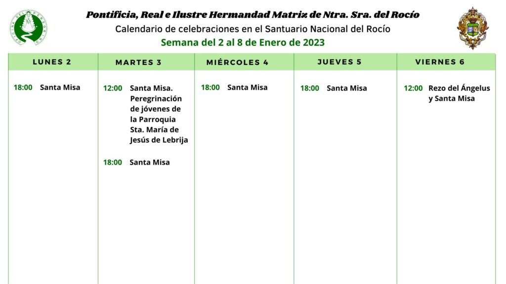 Calendario de celebraciones para la semana del 2 al 8 de Enero de 2023 en el Santuario de Ntra. Sra. del Rocío.