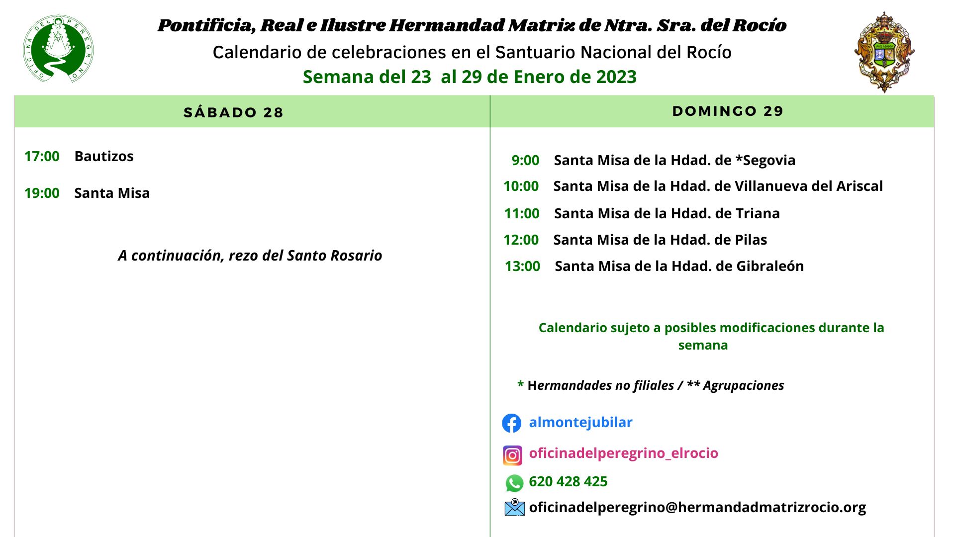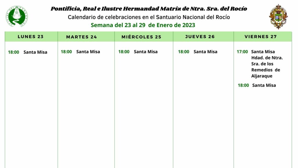 Calendario de celebraciones para la semana del 23 al 29 de Enero, en el Santuario de Ntra. Sra. del Rocío.