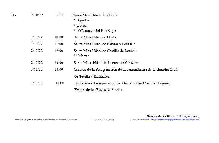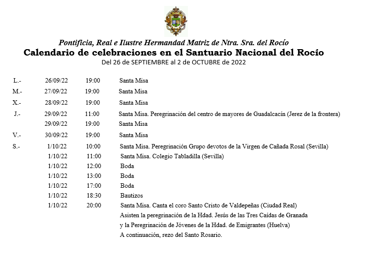 Calendario de celebraciones para la semana del 26 de septiembre al 2 de octubre, en el Santuario de Ntra. Sra. del Rocío.