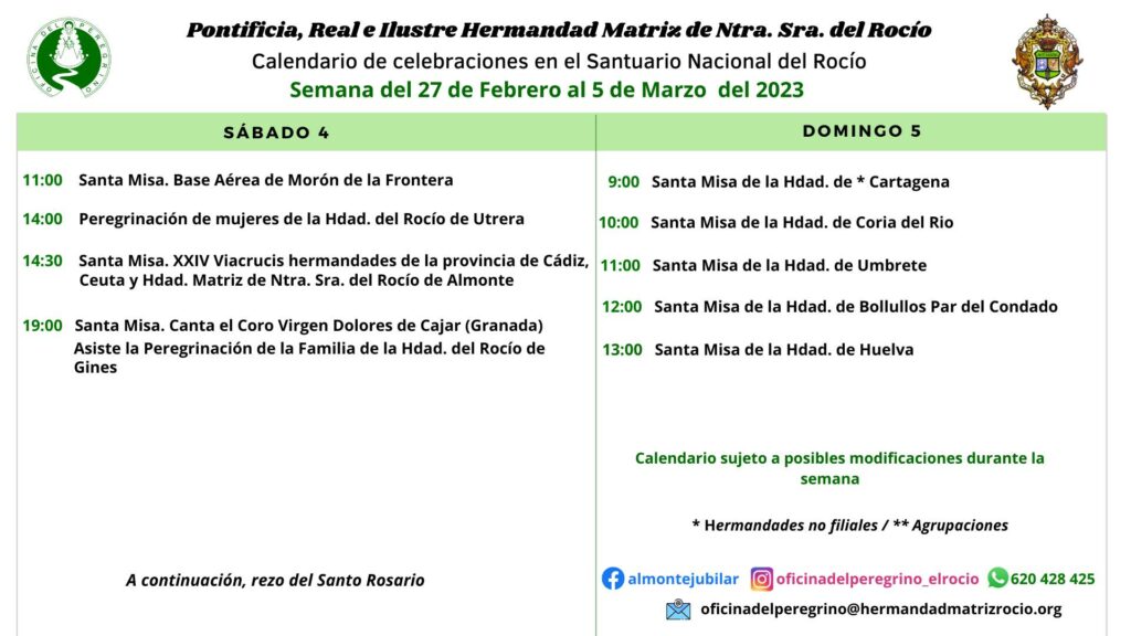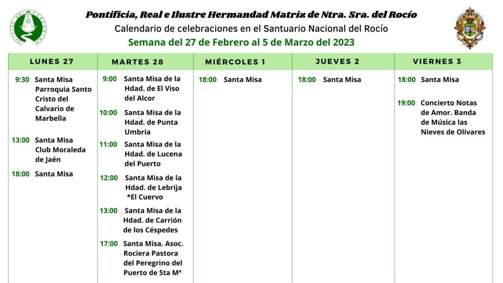 Calendario de celebraciones para la semana del 27 de febrero al 5 de marzo, en el Santuario de Ntra. Sra. del Rocío.