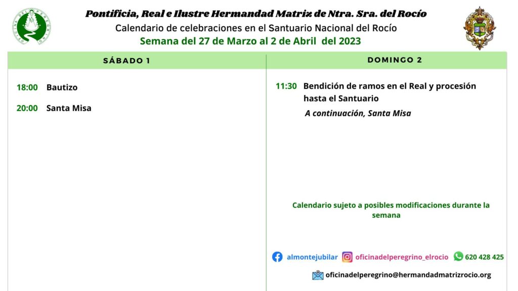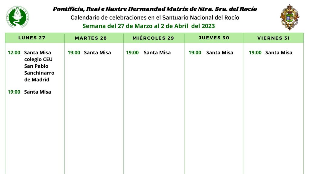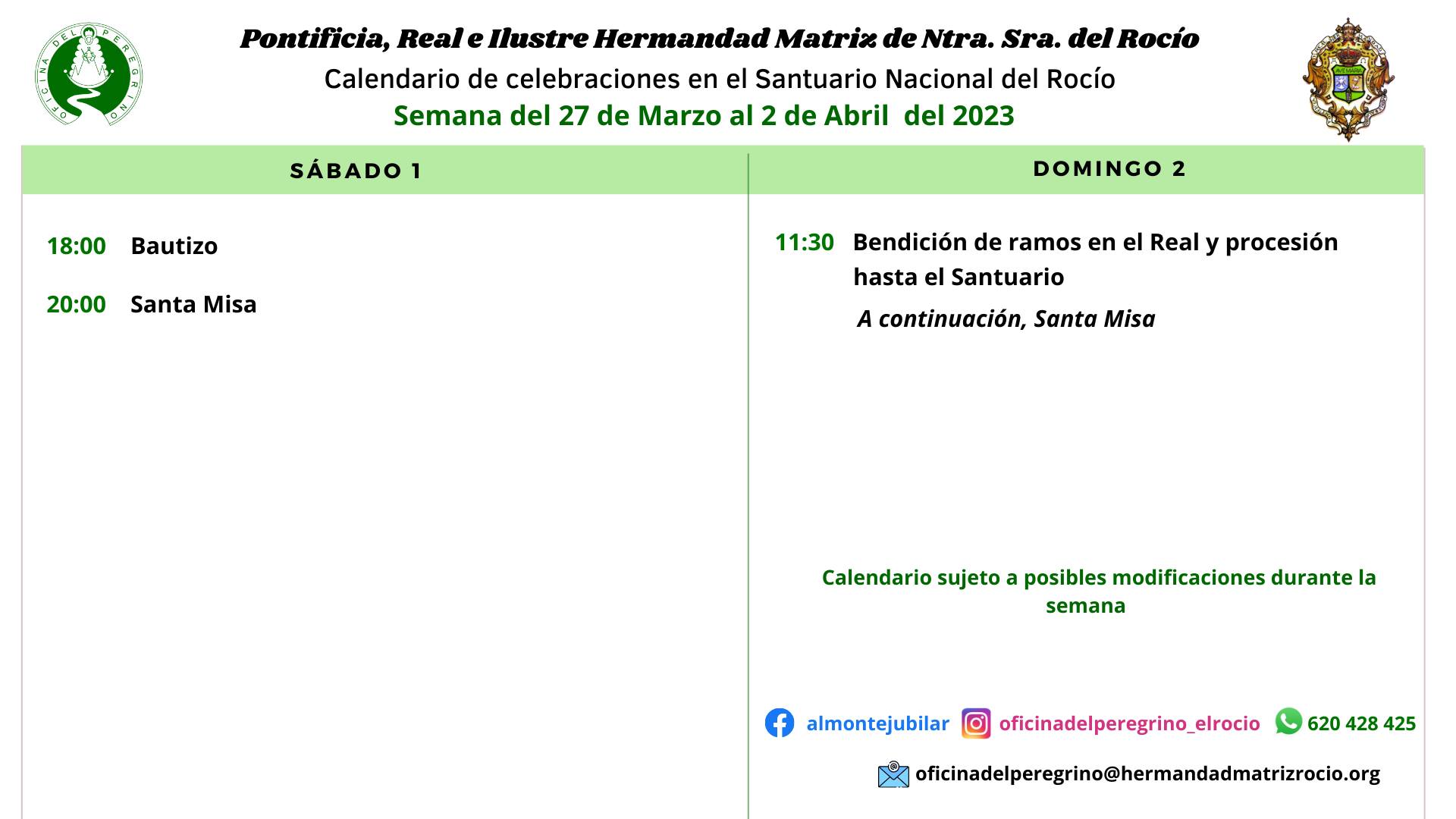 Calendario de celebraciones para la semana del 27de marzo al 2 de abril, en el Santuario de Ntra. Sra. del Rocío.