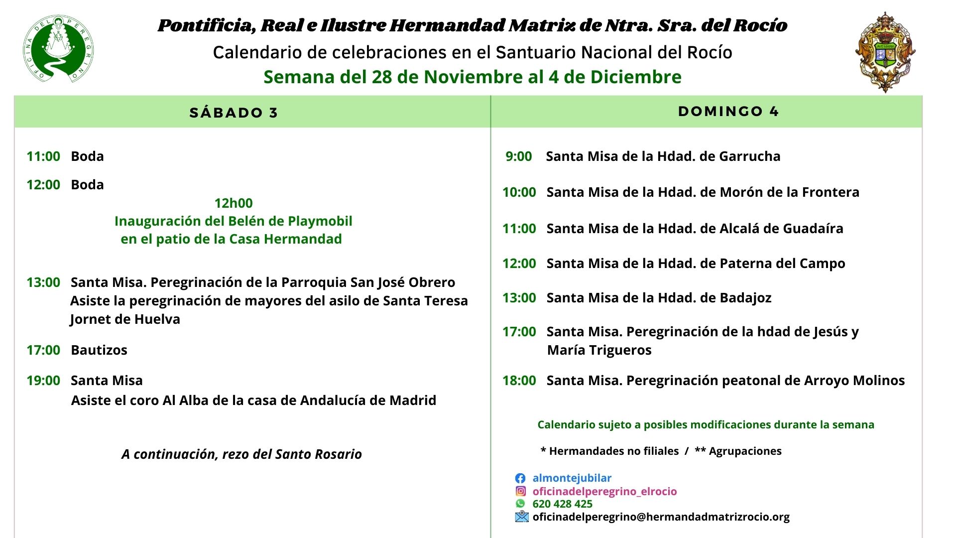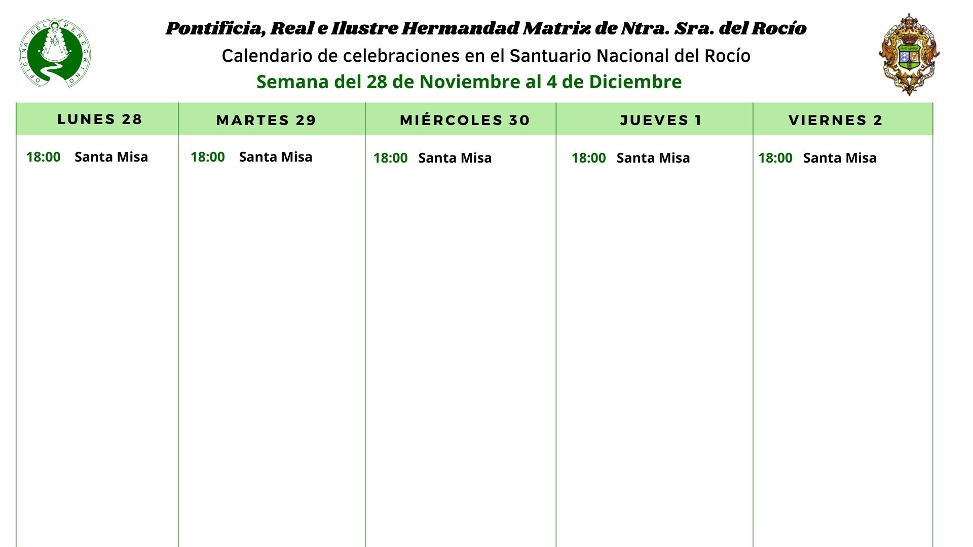 Calendario de celebraciones para la semana del 28 de noviembre al 4 de Diciembre, en el Santuario de Ntra. Sra. del Rocío.