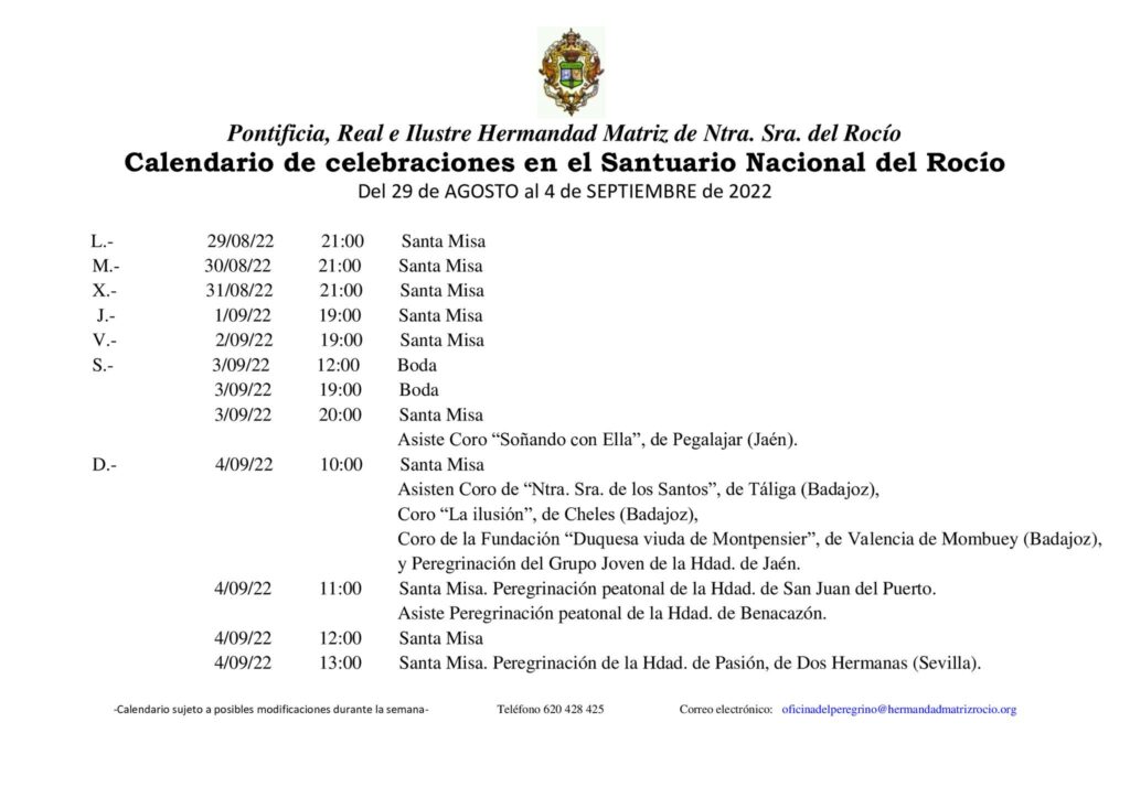 Calendario de celebraciones para la semana del 29 de agosto al 4 de septiembre, en el Santuario de Ntra. Sra. del Rocío.