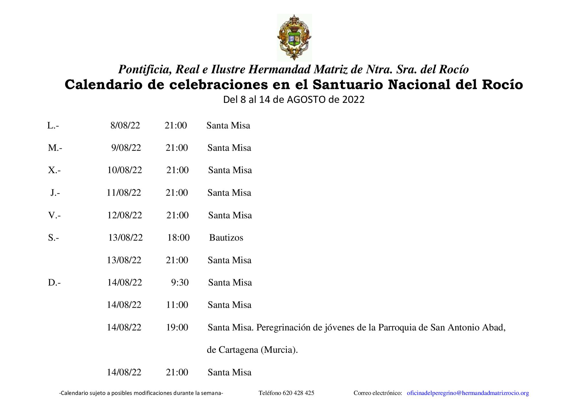 Calendario de celebraciones para la semana del 8 al 14 de agosto, en el Santuario de Ntra. Sra. del Rocío.