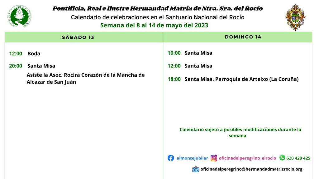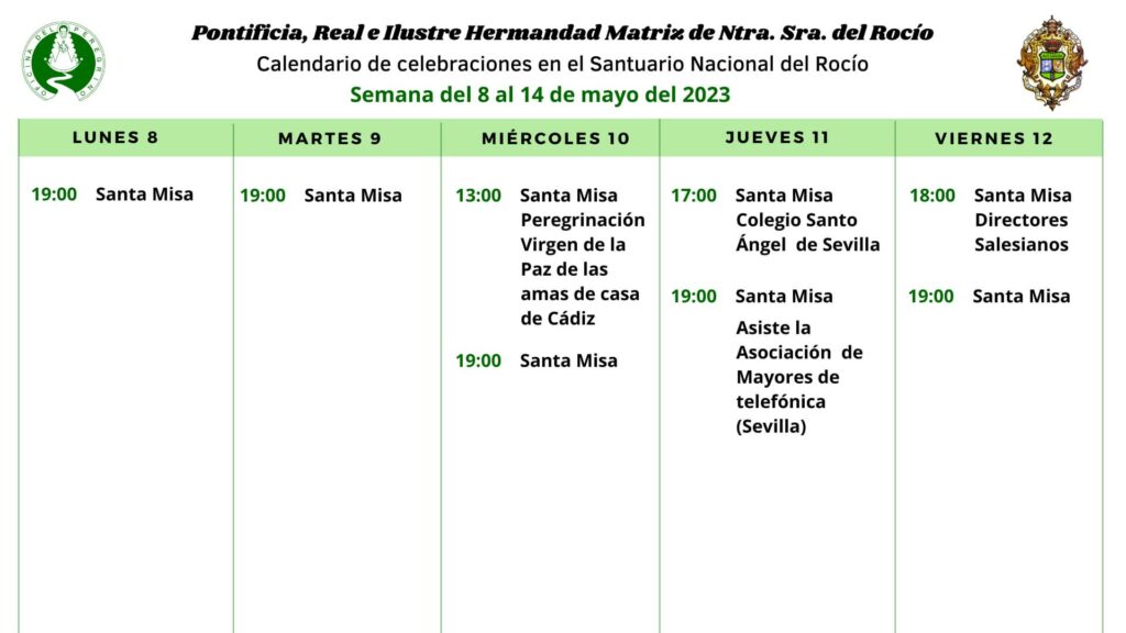 Calendario de celebraciones para la semana del 8 al 14 de mayo, en el Santuario de Ntra. Sra. del Rocío.
