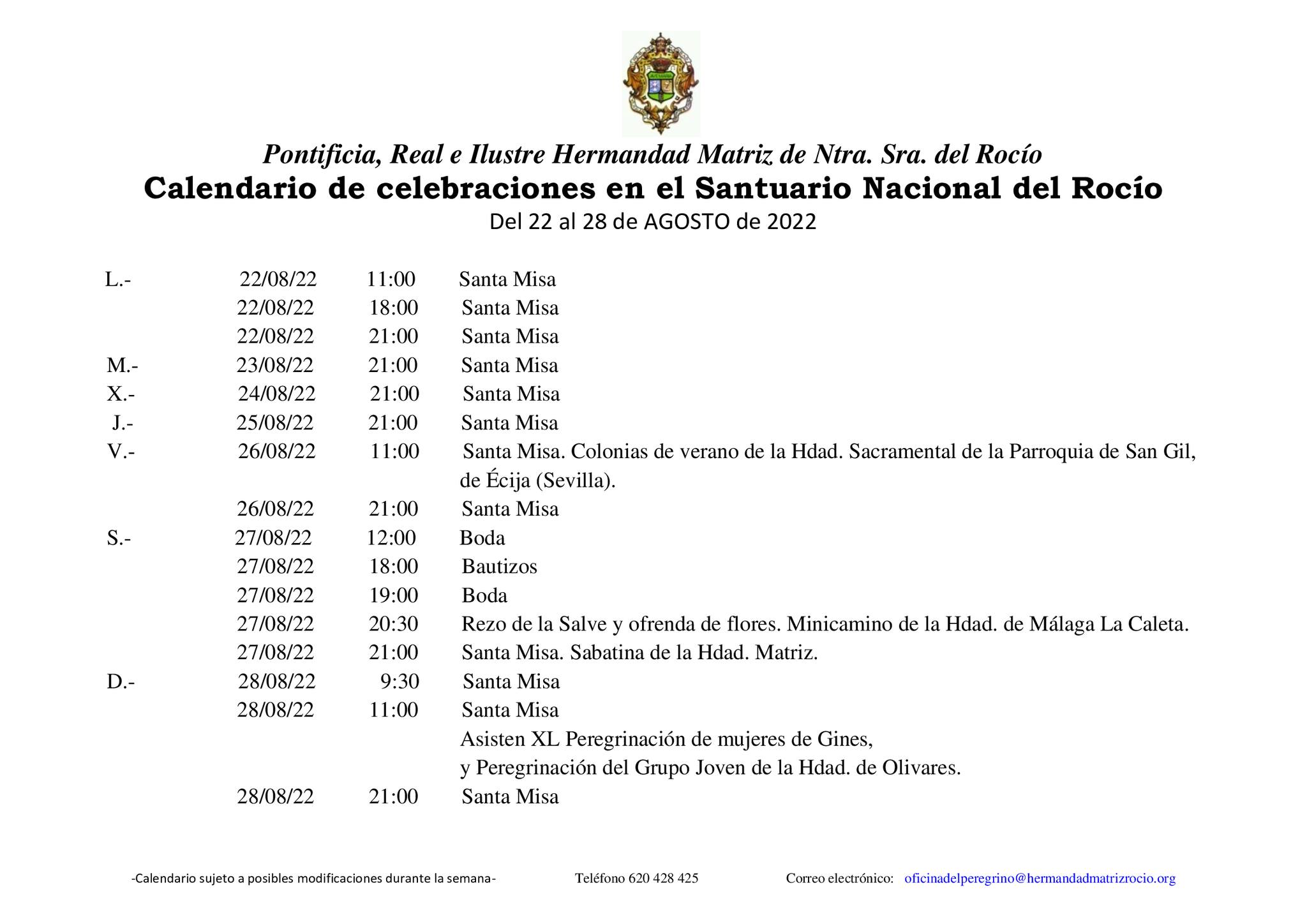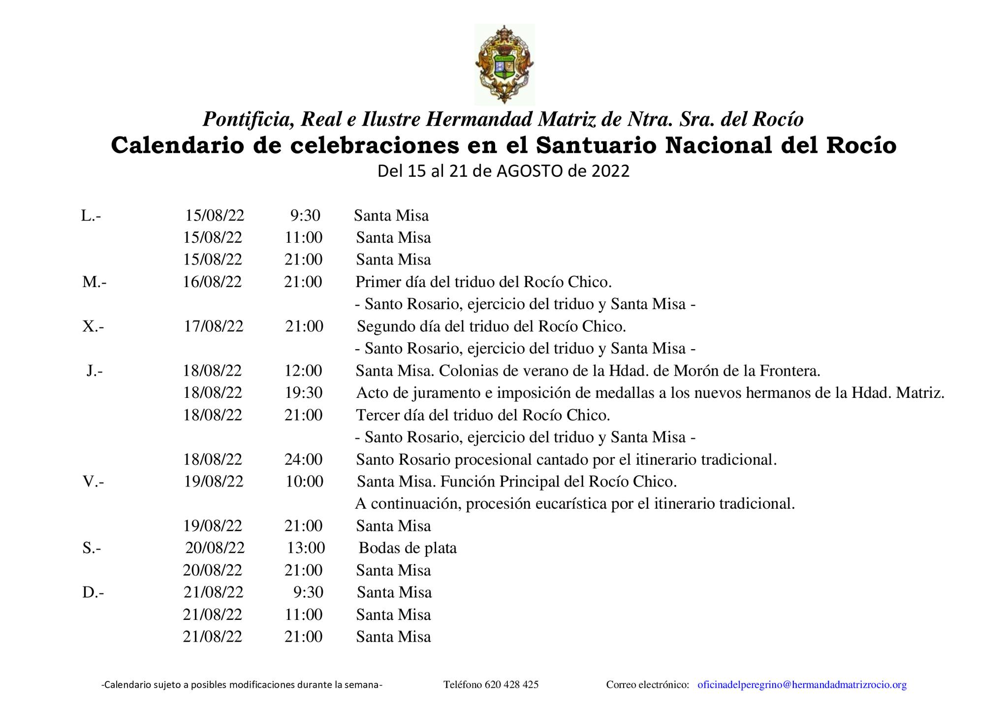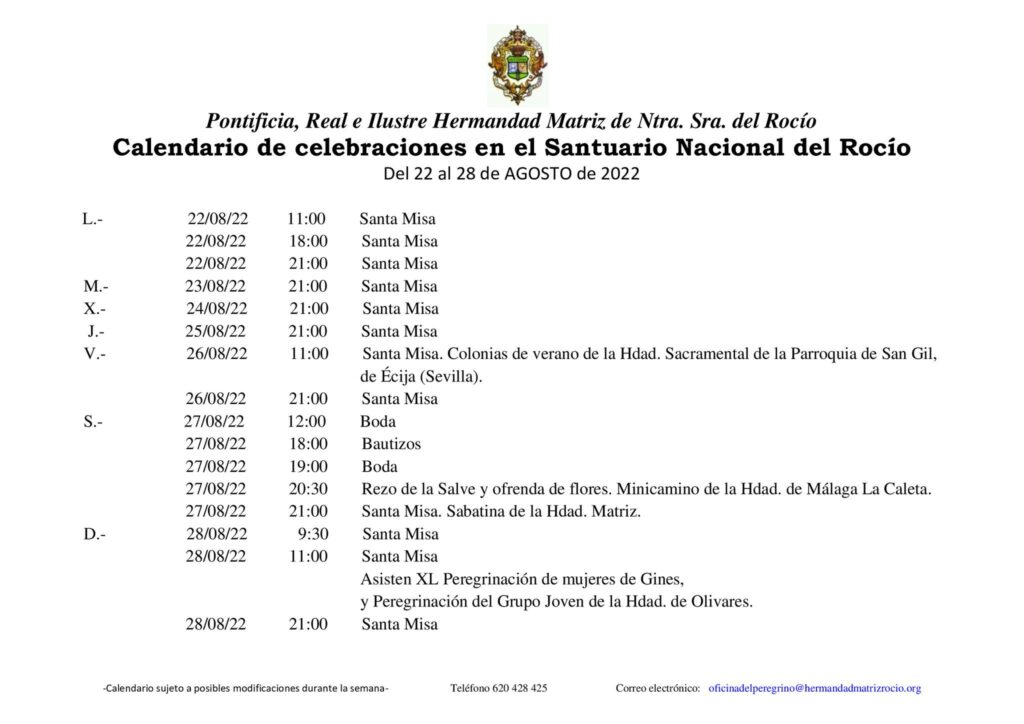 Calendario de celebraciones para la semana del 15 al 28 de agosto en el Santuario de Ntra. Sra. del Rocío.