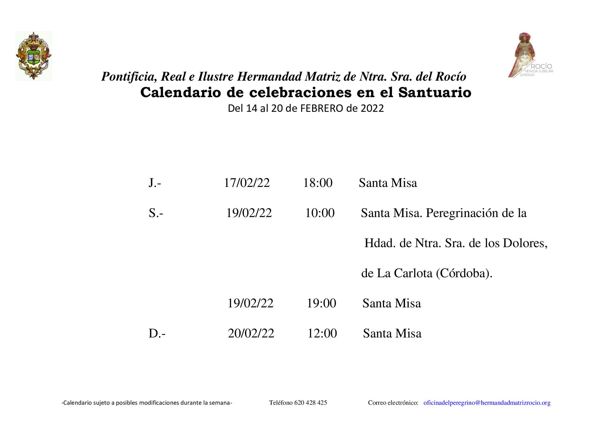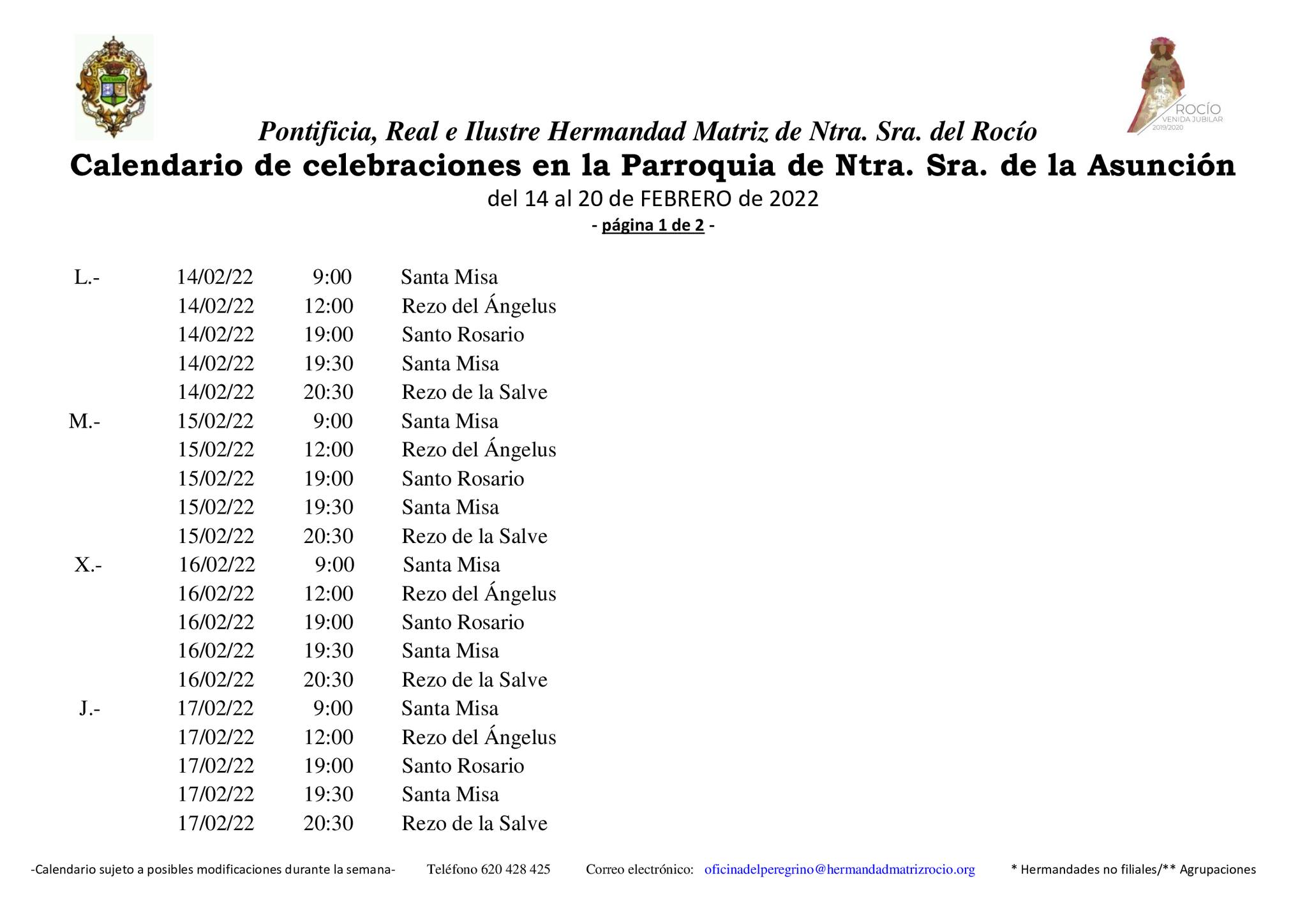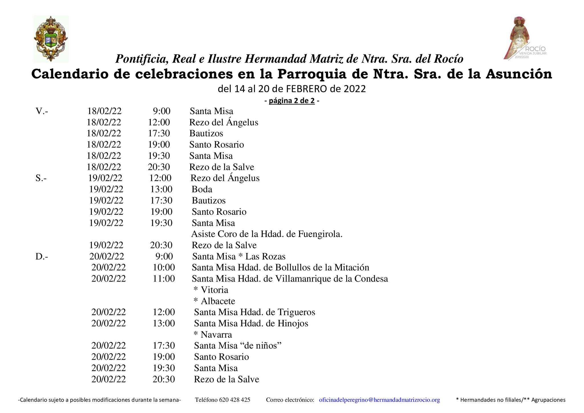 Calendario de celebraciones para la semana del 14 al 20 de febrero, en la Parroquia de Ntra. Sra. de la Asunción y en el Santuario de Ntra. Sra. del Rocío.