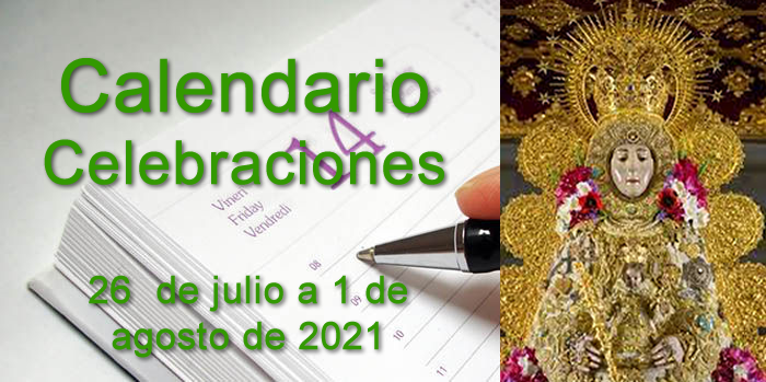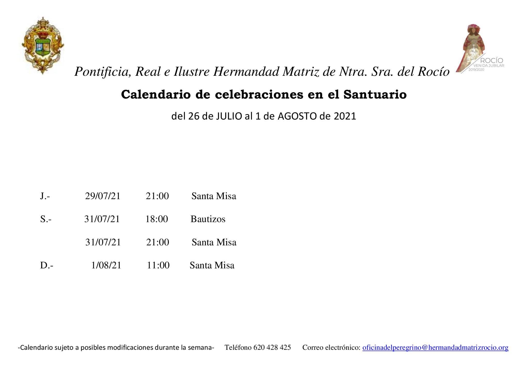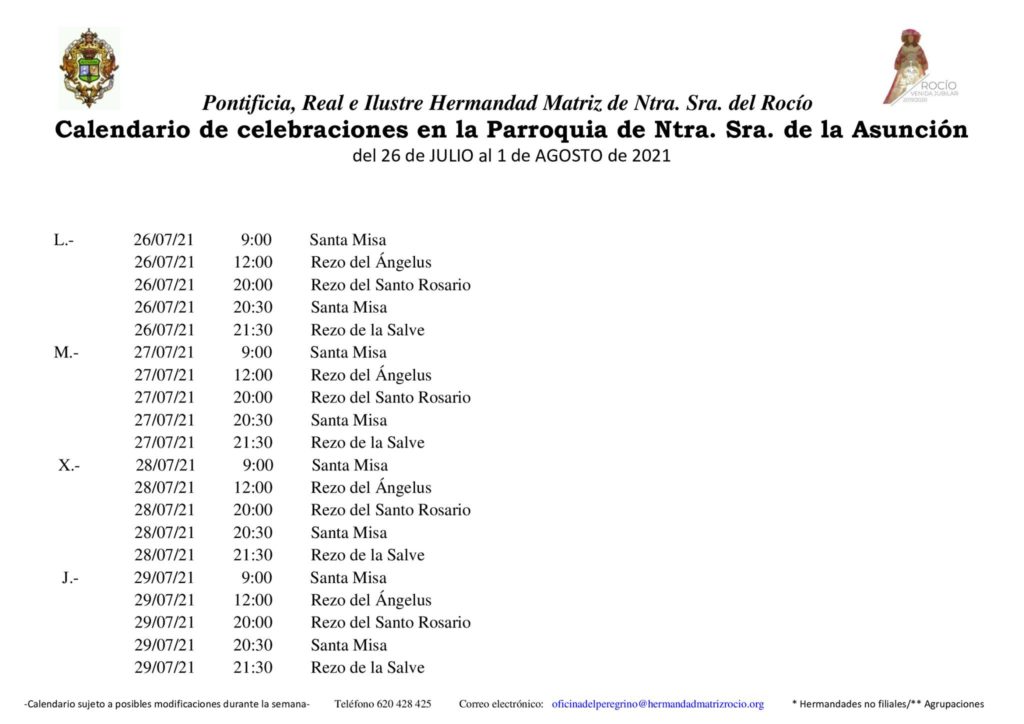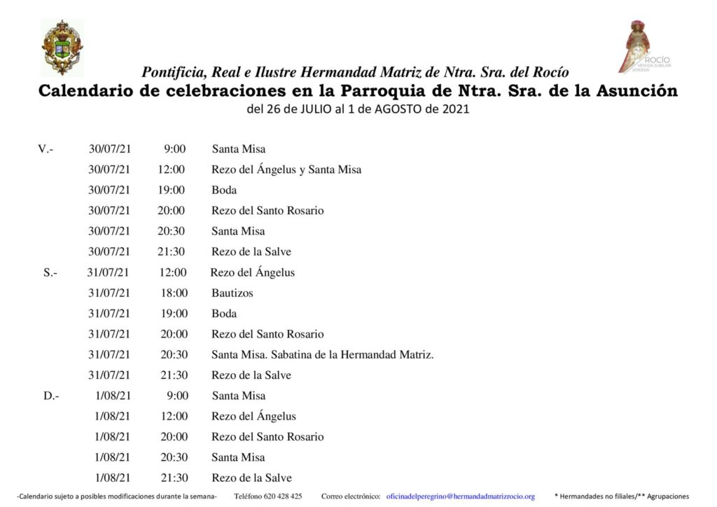 Calendario de celebraciones para la semana del 26 de julio al 1 de agosto, en la Parroquia de Ntra. Sra. de la Asunción y en el Santuario de Ntra. Sra. del Rocío.
