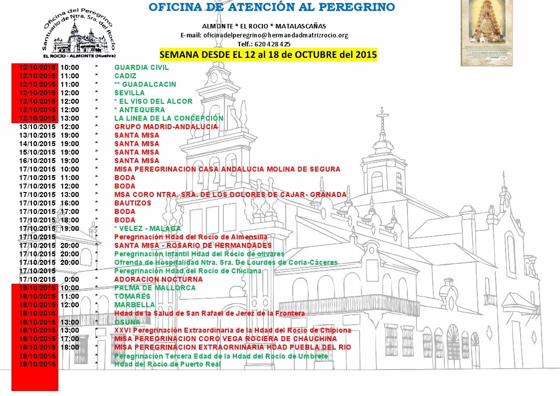 Calendario de Peregrinaciones al Santuario del Rocio del 12 al 18 de octubre de 2015 sujeto a modificaciones de ultima hora.