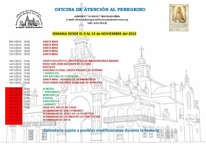 La Oficina de Atención al Peregrino nos remite el Calendario de Peregrinaciones al Santuario del Rocío del 9 al 15 de noviembre de 2015.