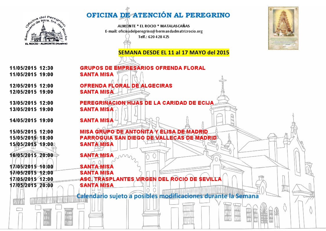 Calendario peregrinaciones  del 11 a 17 de mayo 2015