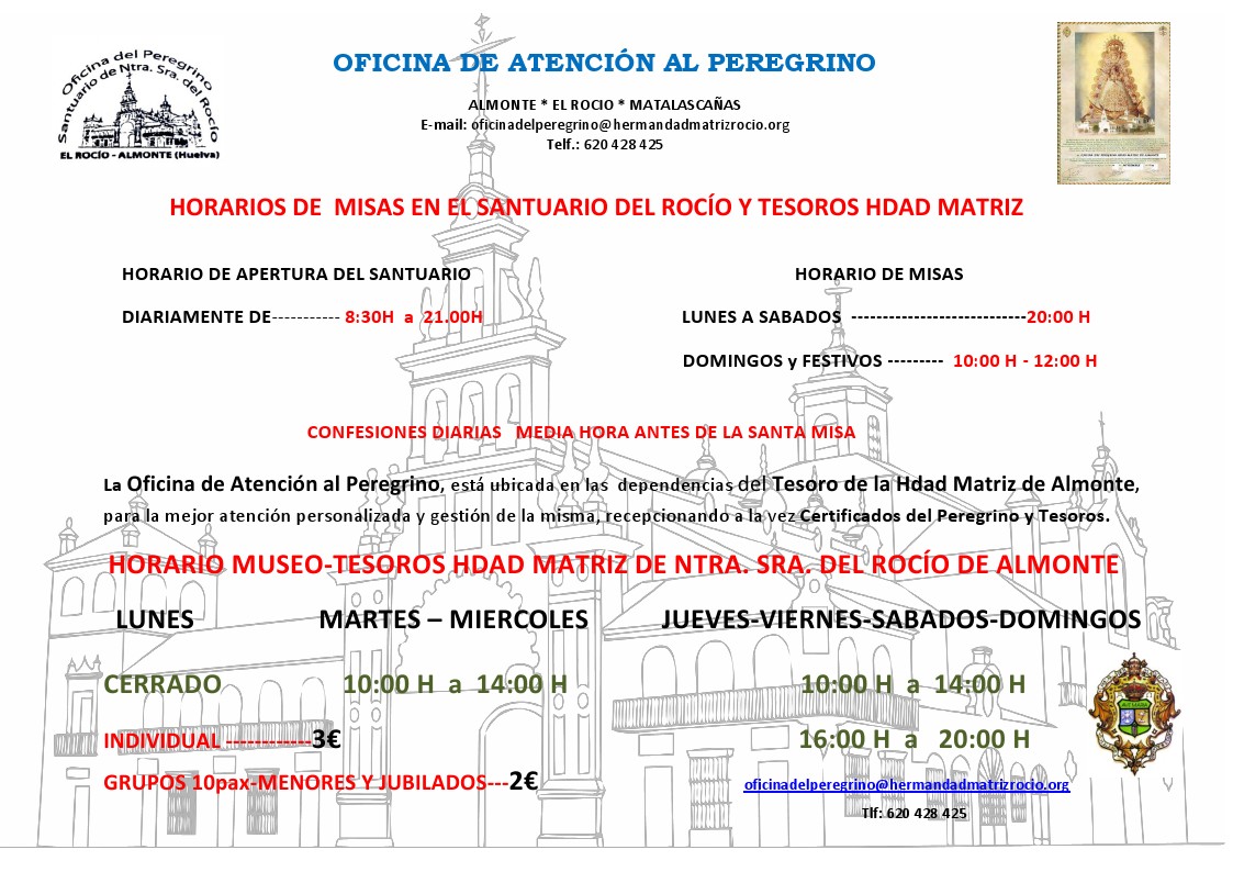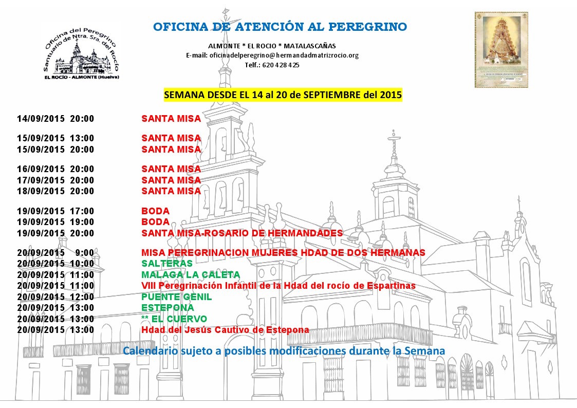 La Oficina de Atención al Peregrino nos remite el Calendario de Peregrinaciones del 14 al 20 de septiembre de 2015, así como el horario de Misas en el Santuario del Rocío y el de visitas al Museo.