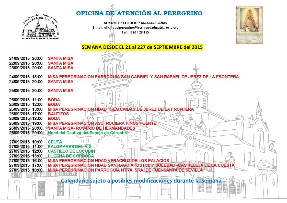 La Oficina de Atención al Peregrino nos remite el Calendario de Peregrinaciones al Santuario del Rocío del 21 al 27 de septiembre de 2015.
