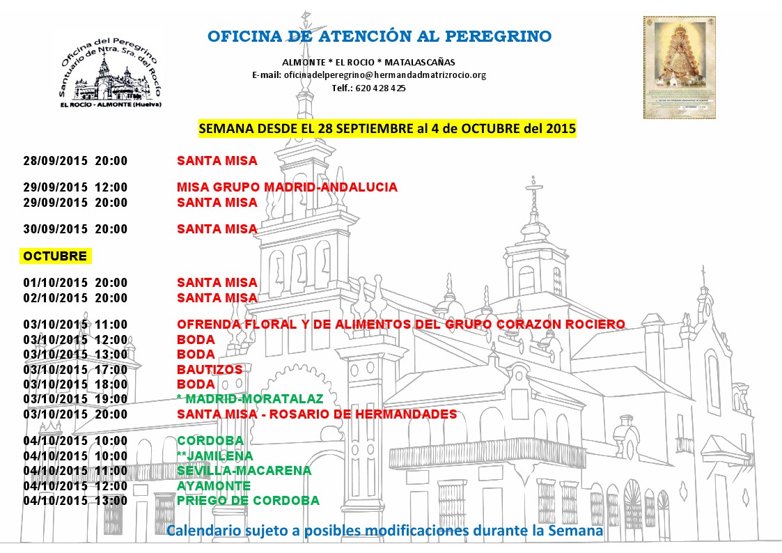 Calendario de Peregrinaciones al Santuario del Rocio del 28 de septiembre al 4 de octubre de 2015.