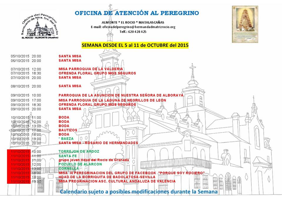 Calendario Semanal de Peregrinaciones al Santuario del Rocio, sujeto a posibles modificaciones durante la Semana.