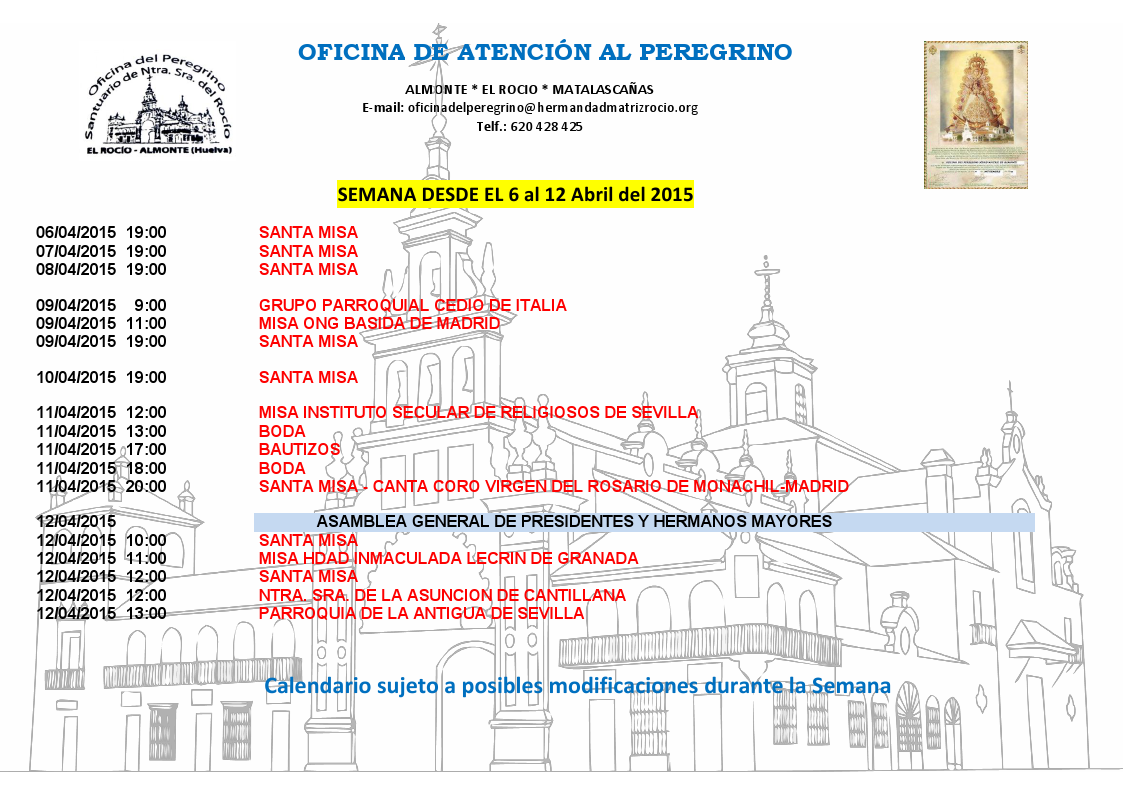 La Oficina del Peregrino Del Santuario del Rocío nos remite el Calendario semanal de peregrinaciones al Santuario del Rocío del 6 al 12 de abril de 2015.