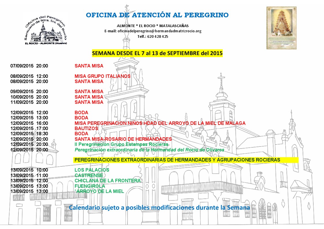 Calendario de Peregrinaciones del 7 al 13 de septiembre de 2015