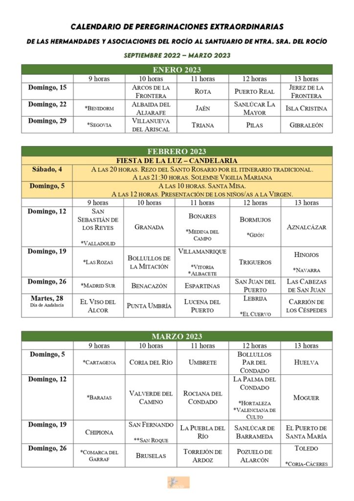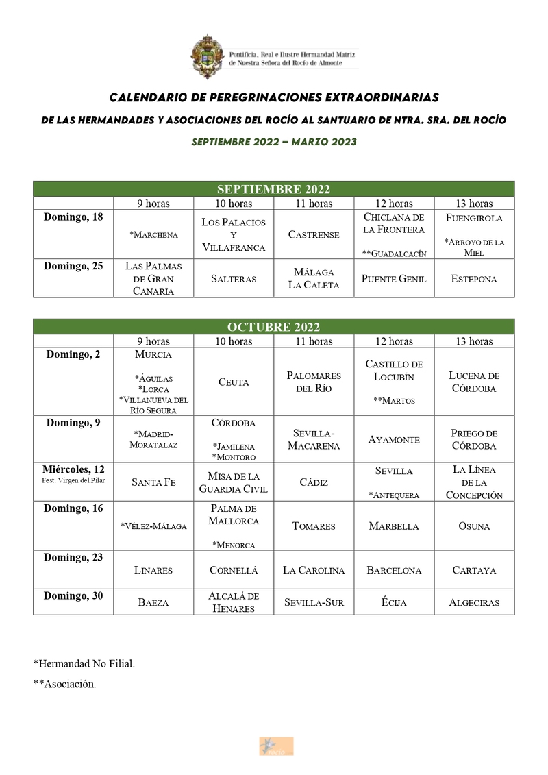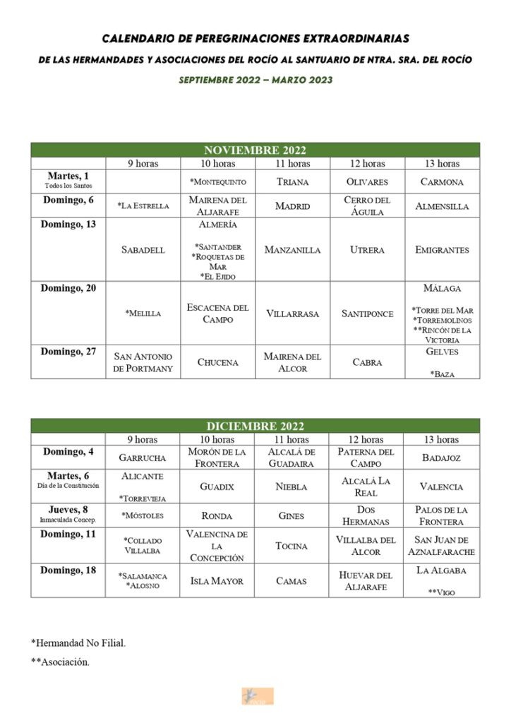 Además de cada Pentecostés, las hermandades del Rocío peregrinan hasta las plantas de la Virgen, con su simpecado, a lo largo del curso. La Hermandad Matriz coordina este calendario de peregrinaciones extraordinarias junto a las filiales, no filiales y asociaciones que hoy se ha dado a conocer.
