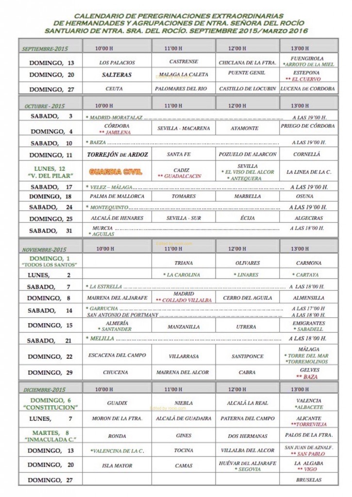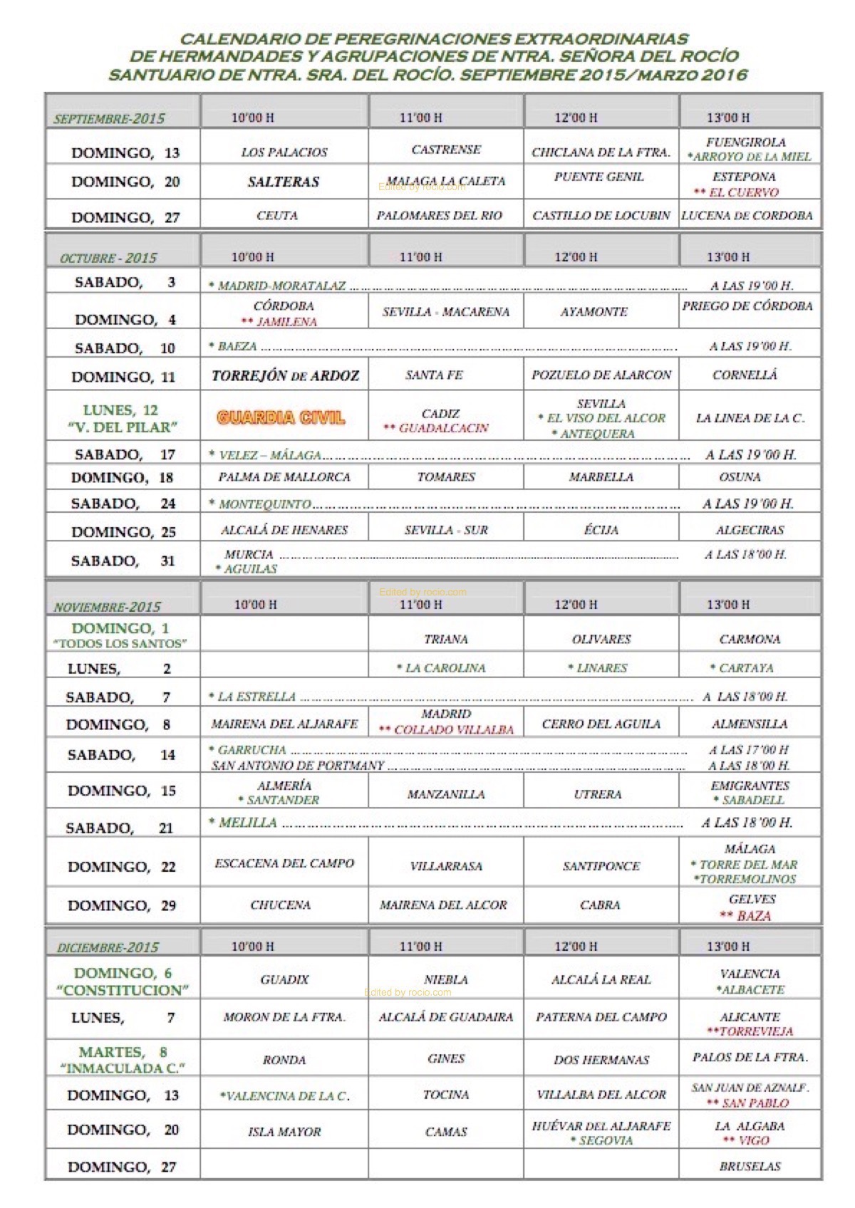 Calendario de Peregrinaciones Extraordinarias de las Hermandades y Agrupaciones al Santuario de Septiembre 2015 a marzo 2016.