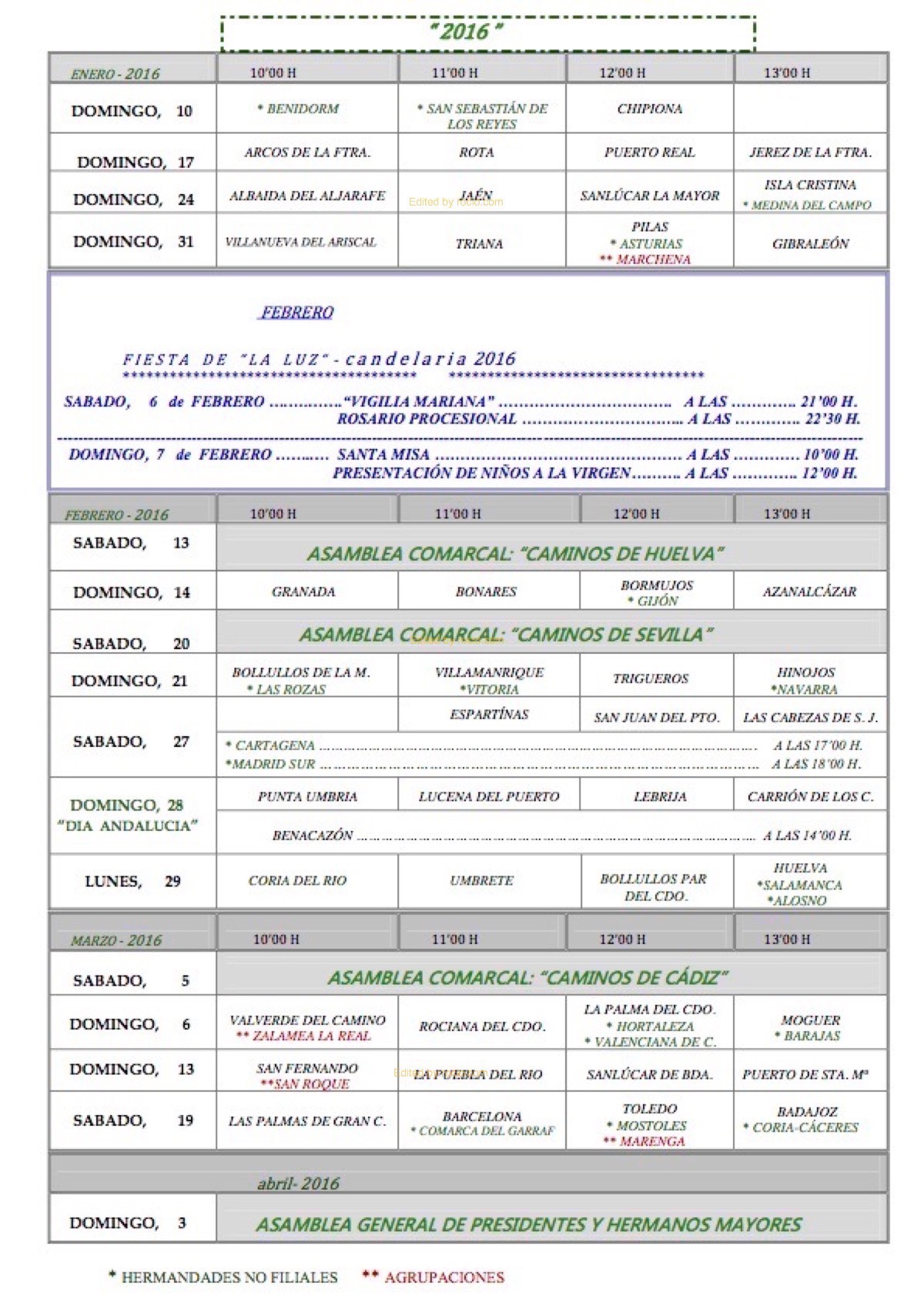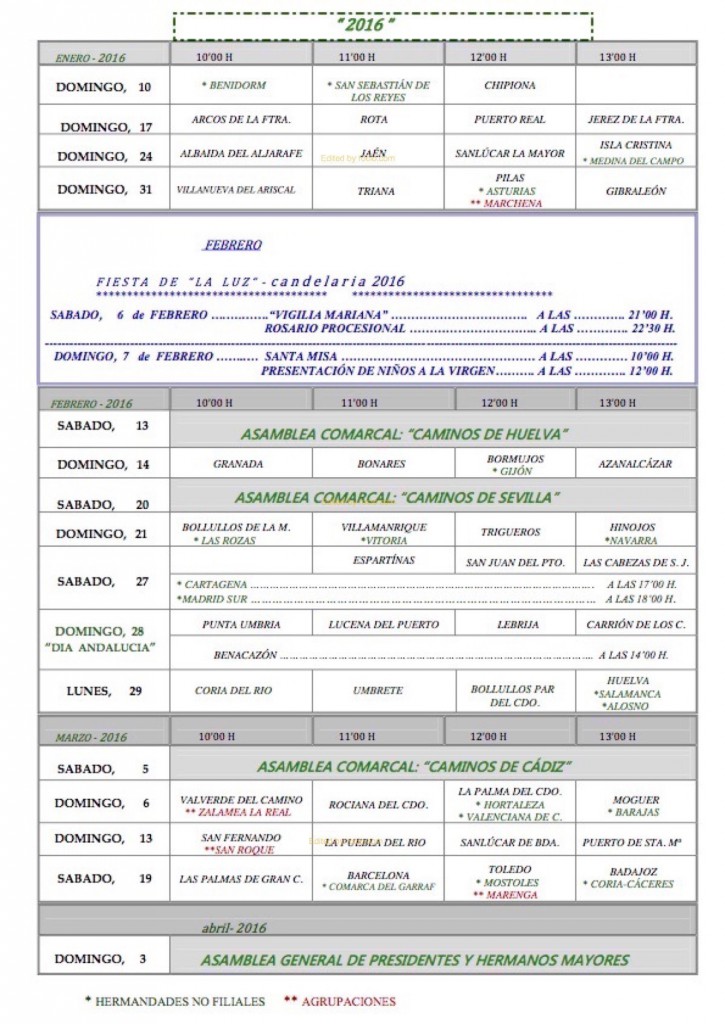 Pregunta: Alguien podía decirme, donde se celebra este año la Asamblea Comarcal de Hermandades de los caminos de Huelva, prevista para el día 13 de febrero del 2016. Me refiero a la localidad.