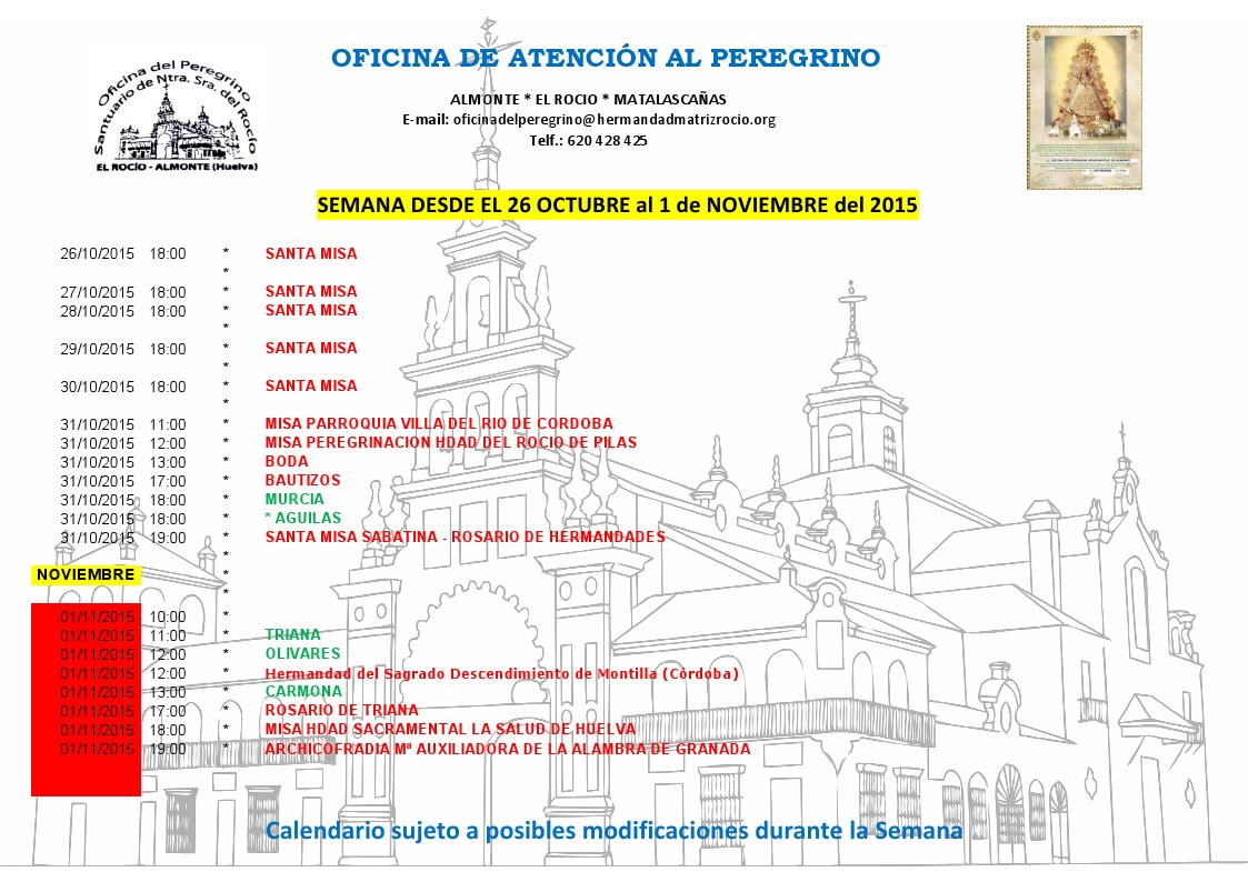La Oficina del Peregrino Del Santuario del Rocío nos remite el Calendario de Peregrinaciones Extraordinarias del 26 de octubre al 1 de noviembre de 2015.
